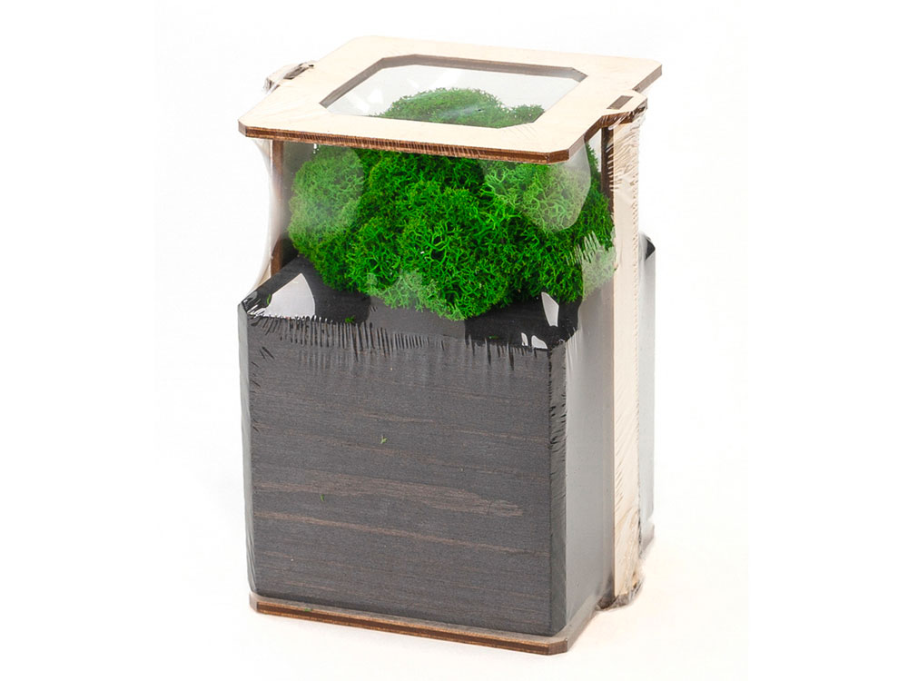 Изделие состоит из стабилизированного мха ягеля, деревянного куба и деревянного упаковочного каркаса. Отталкивает пыль и придает интерьеру индивидуальность. Размер изделия 8х8х13 см.