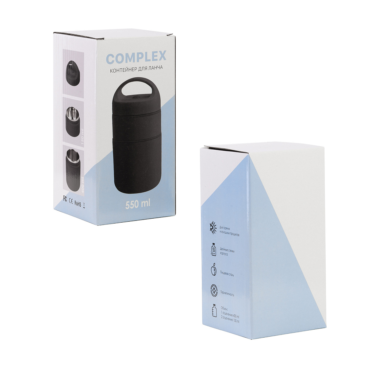 Ланчбокс "Complex" - это удобно! 2 отделения: 400 мл для первых и вторых блюд и 150 мл для соусов, сухариков, закусок, снеков, ягод и др.