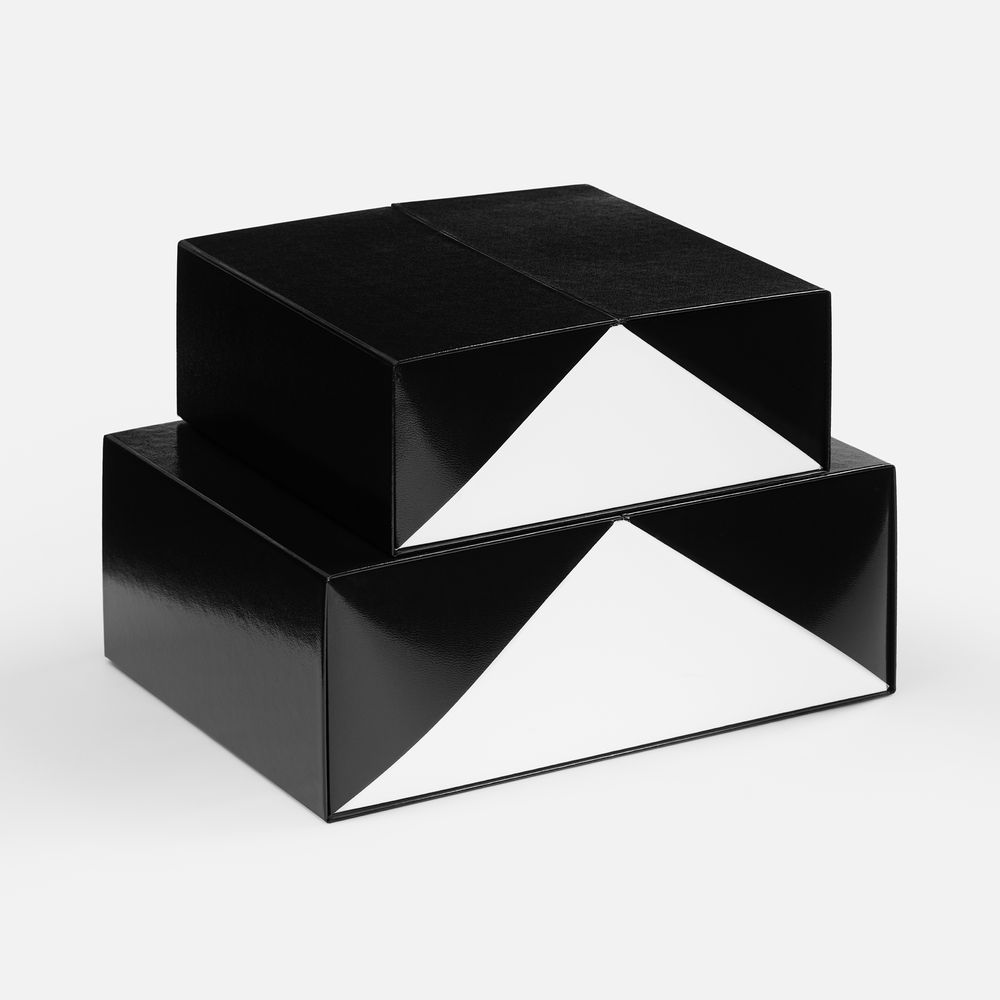 Коробка из переплетного картона 2 мм с оригинальной конструкцией: две симметричные створки открываются, создавая эффектную презентацию содержимого. Складная система на предустановленный двусторонний скотч делает сборку коробки быстрой и интуитивно понятной.