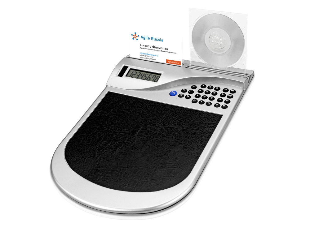 Удобный многофункциональный коврик с встроенным калькулятором и подставками для дисков и визиток – отличный подарок, который поможет с организацией рабочего места на столе и борьбой с беспорядком.