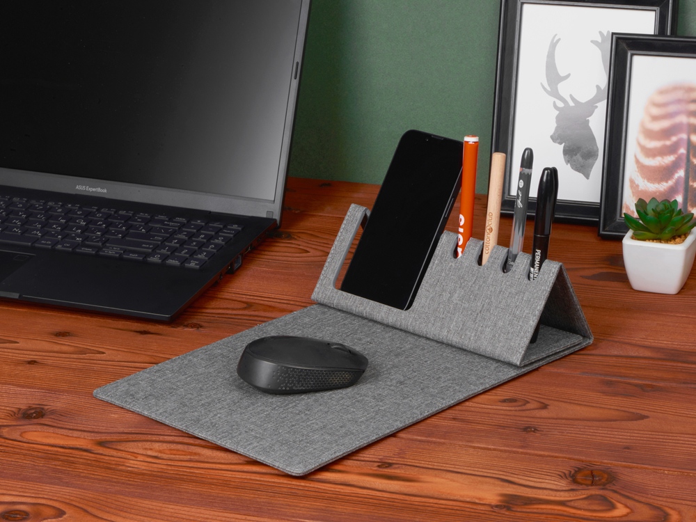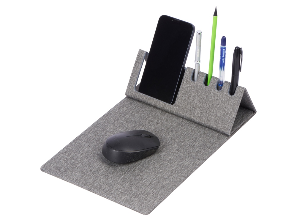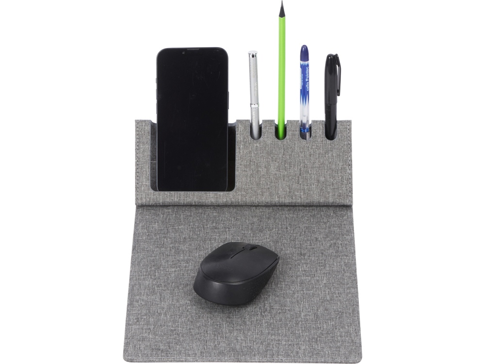 Коврик для мыши Formo выполнен из переработанных материалов. В случае загрязнения его легко очистить влажной салфеткой. Противоскользящий слой препятствует перемещению аксессуара по столу в процессе работы, а складная подставка под ручки и смартфоны поможет держать все необходимое под рукой.