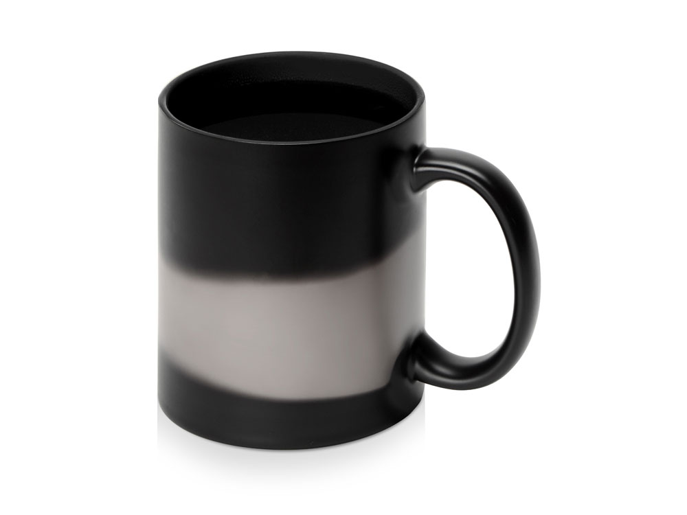 Кружка-хамелеон меняет свой облик, едва вы нальете в нее горячий напиток: черная поверхность постепенно изменяет свой цвет, становясь белой. Внутренняя часть кружки — яркая, цветная, что можно красиво обыграть, удачно сочетая ее с цветом вашего лого или гаммой изображения.