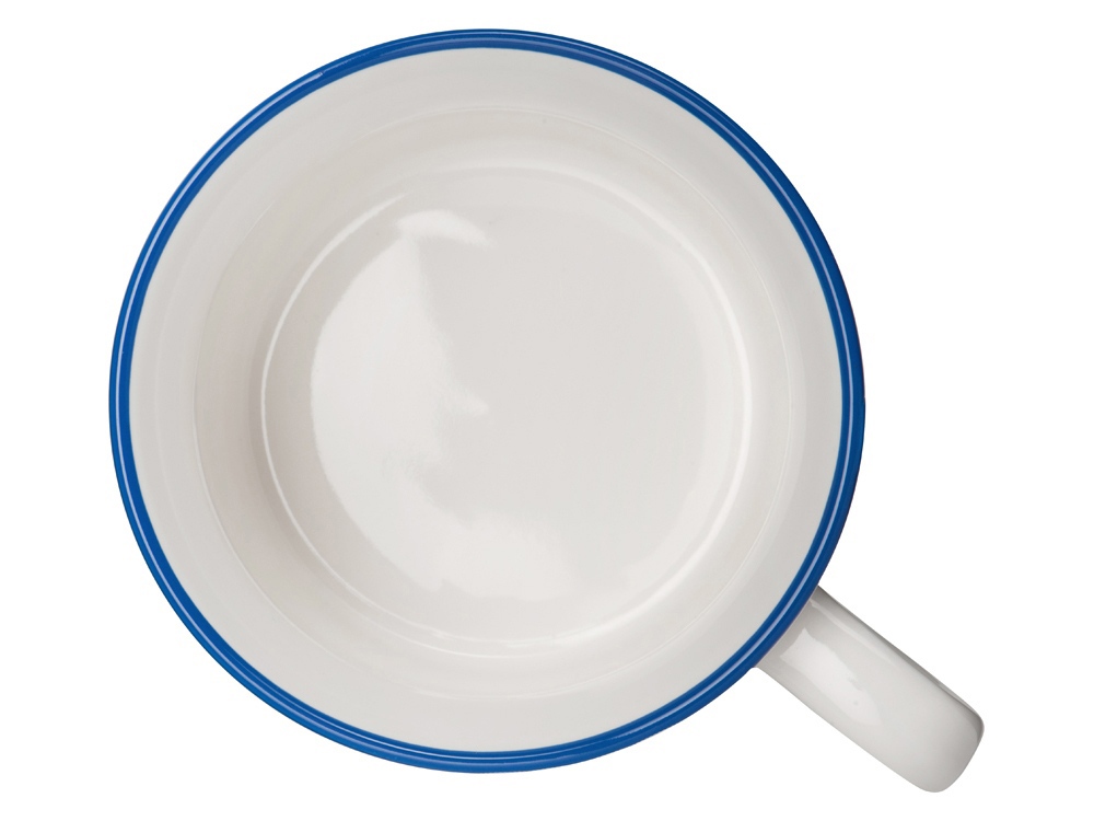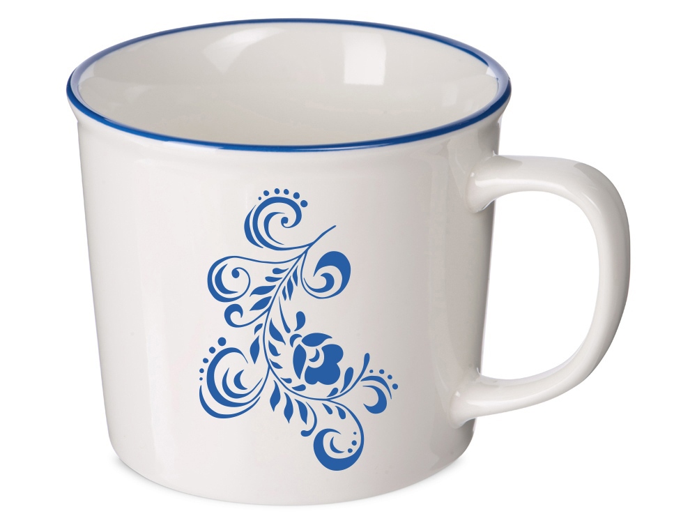 Кружка из костяного фарфора с выраженным рельефным ободком, окаймленным цветной контрастной полосой. Цвет полосы можно органично сочетать с цветом нанесенного логотипа, что придаст дизайну конечного продукта цельность облика.