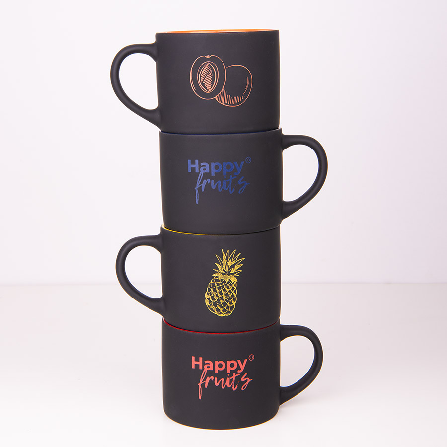 Кружка трендовой цилиндрической формы с черным прорезиненным покрытием.При гравировке подложка вскрывается в цвет внутренней части кружкиЦвет внутренней части близкий к Pantone 298C