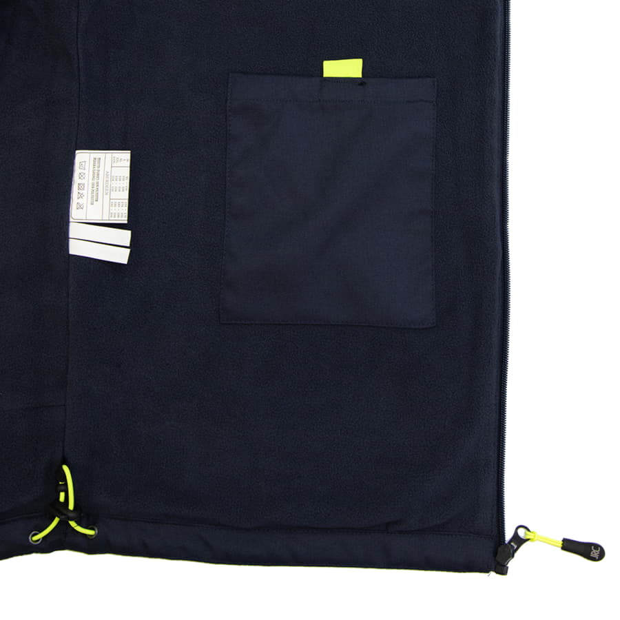 Основная ткань: цвет, близкий к Pantone 5395 U, подкладка: цвет, близкий к Pantone 539 U Водоотталкивающая куртка с флисовой подкладкой. Один нагрудный карман на молнии. Два боковых кармана на молнии. Внутренний карман на липучке. Утягивающий шнурок по низу куртки. Регулируемые манжеты на липучке.
