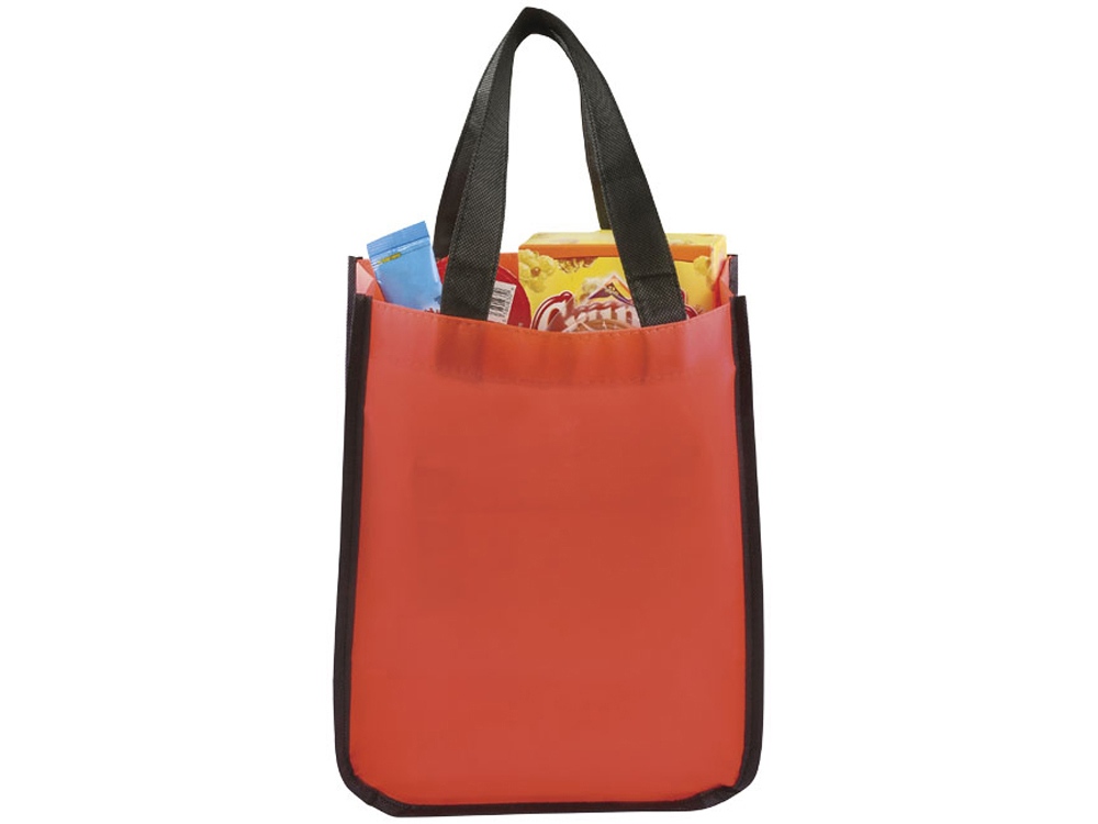 Маленькая ламинированная сумка для покупок. Открытое основное отделение. Ламинированный материал не пропускает воду и его легко чистить. Высота ручек 15,5 см. Ламинированный нетканый полипропилен 80г.