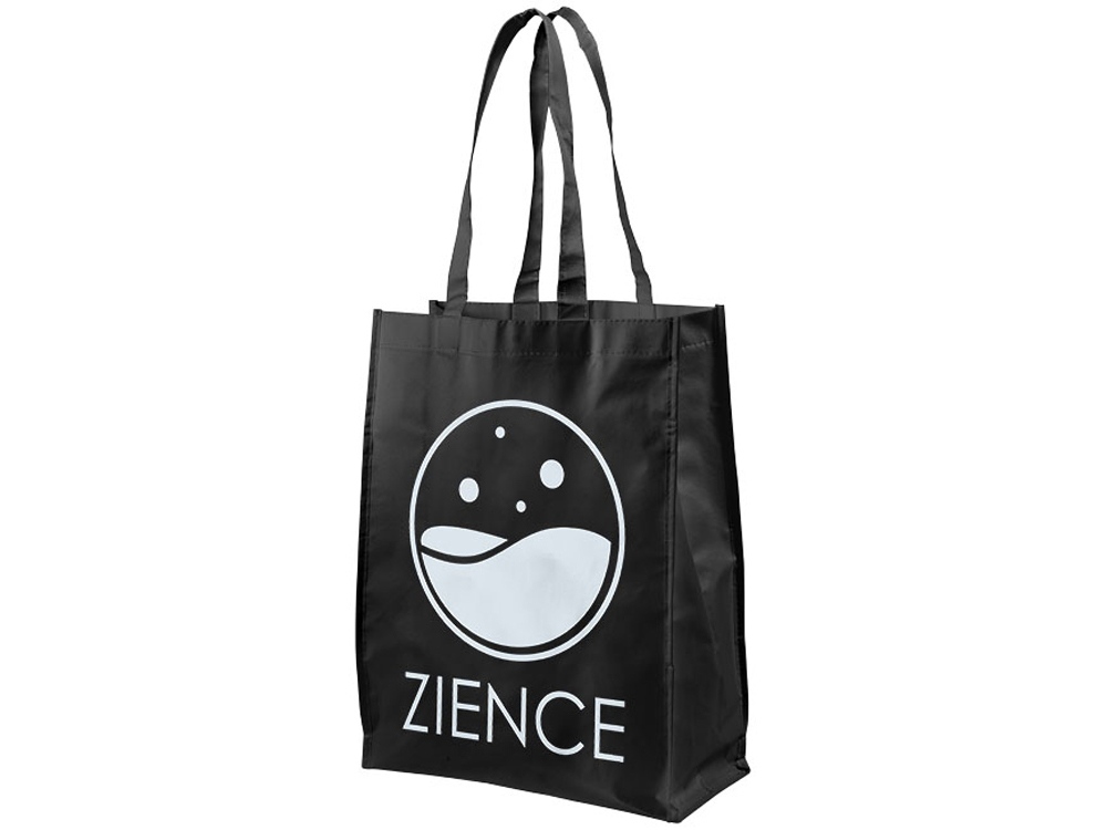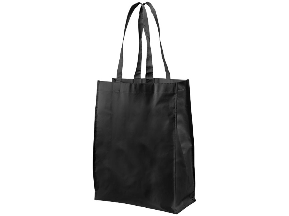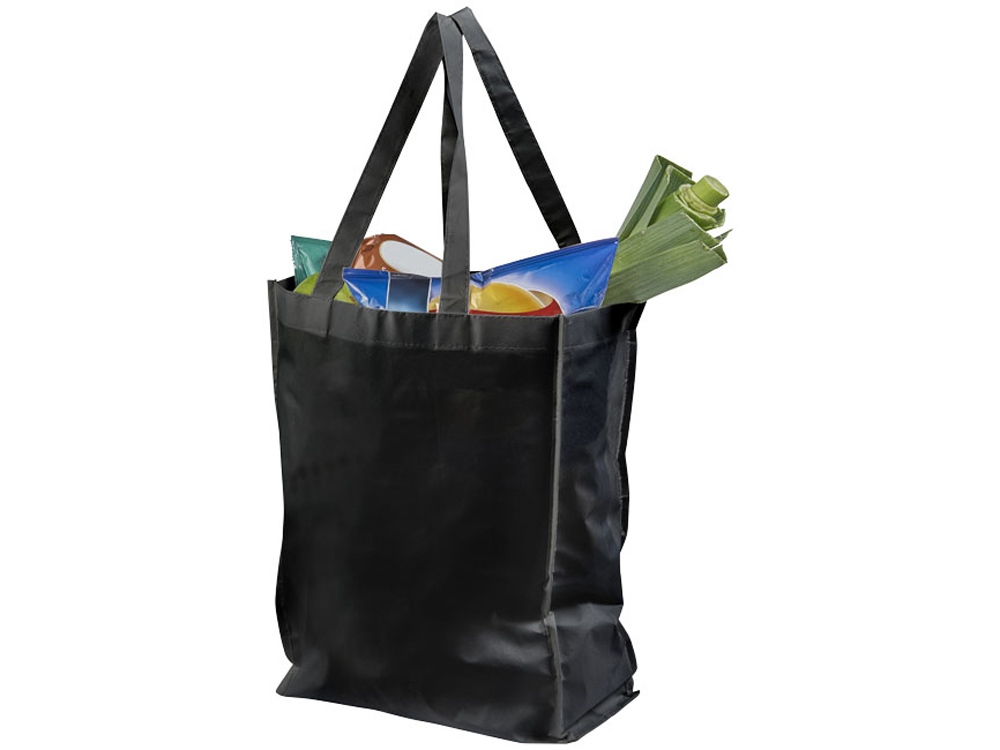 Ламинированная сумка для покупок среднего размера. Открытое основное отделение. Ламинированный материал водонепроницаемый и легко моется. Высота ручек 25 см. Ламинированный нетканый полипропилен 80г.