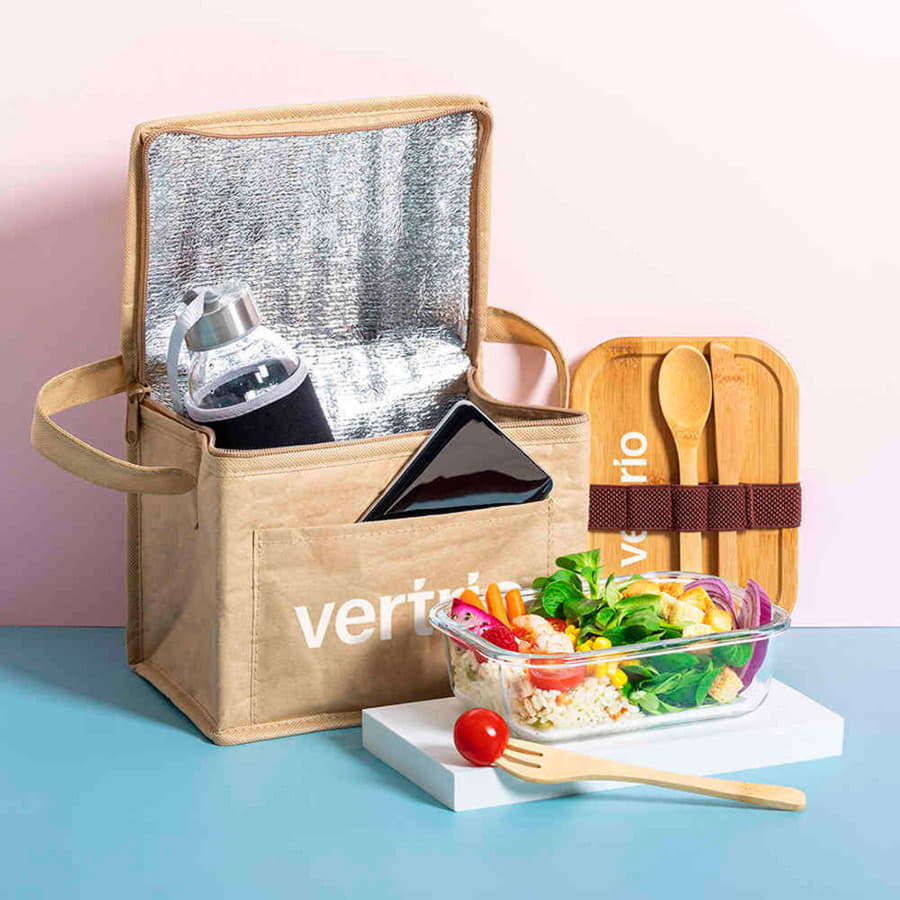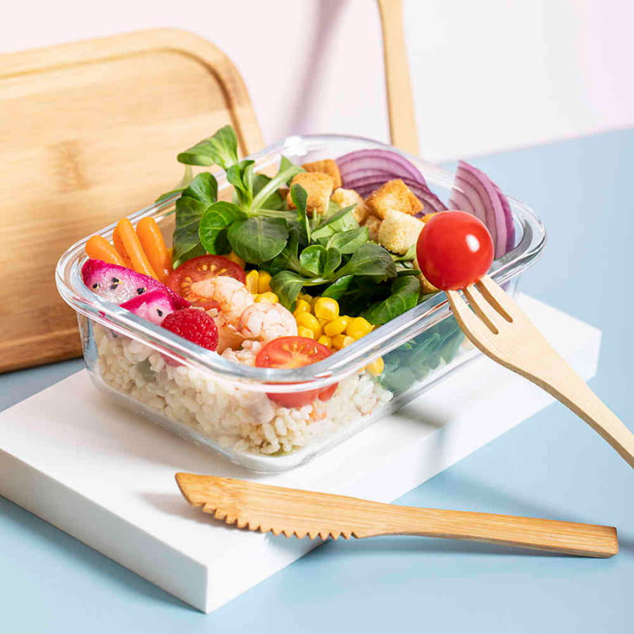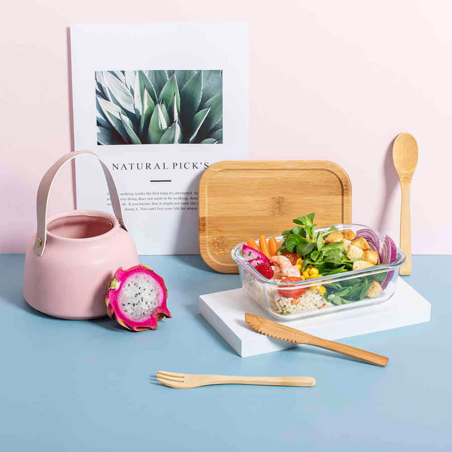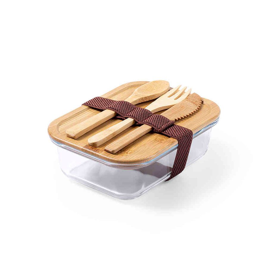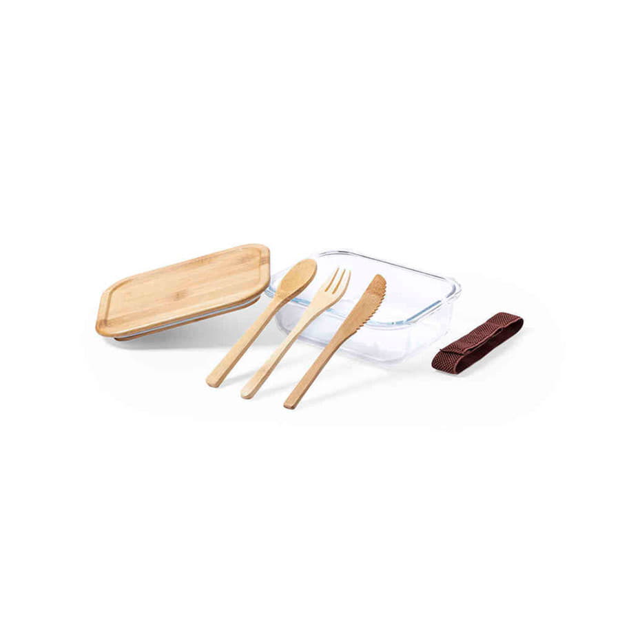 Ланч-бокс с крышкой и столовыми приборами: ложка, вилка, нож. Они крепятся на специальной резинке на корпусе изделия. Крышка сделана из бамбука, оснащена специальной силиконовой лентой по периметру для более плотного прилегания крышки к корпусу и предотвращения протекания. Также крышка может служить небольшим подносом для сервировки. Индивидуальная упаковка - коробка из картона.