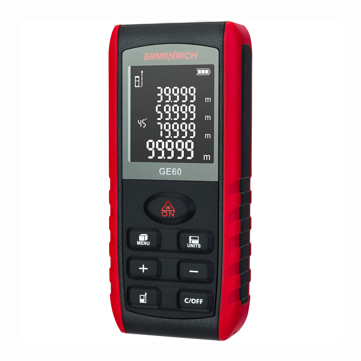 Особенности: Ermenrich Reel GK60 лазерная рулетка для самого широкого применения при измерении линейных размеров, площадей и объемов помещений, зданий и сооружений; диапазон измерения длины 0,05-60 м, единицы измерения длины метры, футы, дюймы, точность измерений ±2 мм; единицы измерения площади квадратные метры, квадратные футы; единицы измерения объема кубические метры, кубические футы; ресурс работы одного комплекта батареек более 5000 измерений; горизонтальный пузырьковый уровень