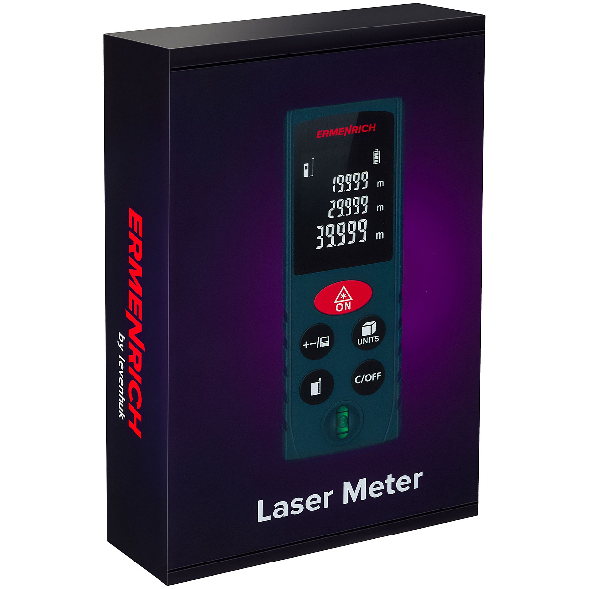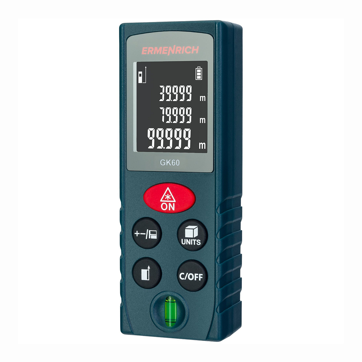 Особенности: Ermenrich Reel GK60 лазерная рулетка для самого широкого применения при измерении линейных размеров, площадей и объемов помещений, зданий и сооружений; диапазон измерения длины 0,05-60 м, единицы измерения длины метры, футы, дюймы, точность измерений ±2 мм; единицы измерения площади квадратные метры, квадратные футы; единицы измерения объема кубические метры, кубические футы; ресурс работы одного комплекта батареек более 5000 измерений; горизонтальный пузырьковый уровень