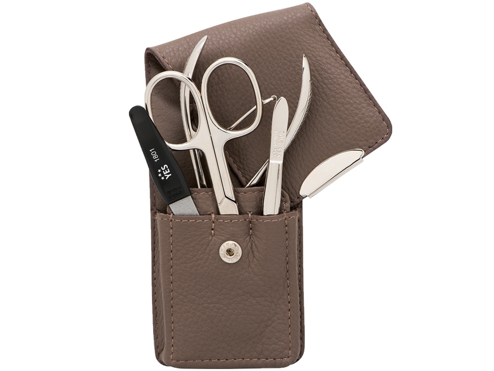Элегантный чехол на кнопке выполнен из натуральной итальянской воловьей кожи, инструменты изготовлены из углеродистой стали превосходного качества.