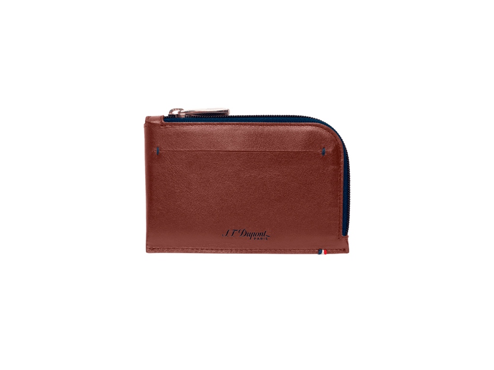 Компактную монетницу из телячьей кожи, коричневой снаружи и синей внутри, с деликатной строчкой и тисненым логотипом S.T. Dupont можно использовать как кошелек или визитницу. Внутреннее отделение застегивается на молнию.