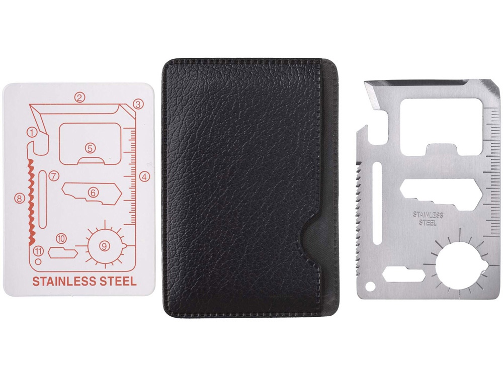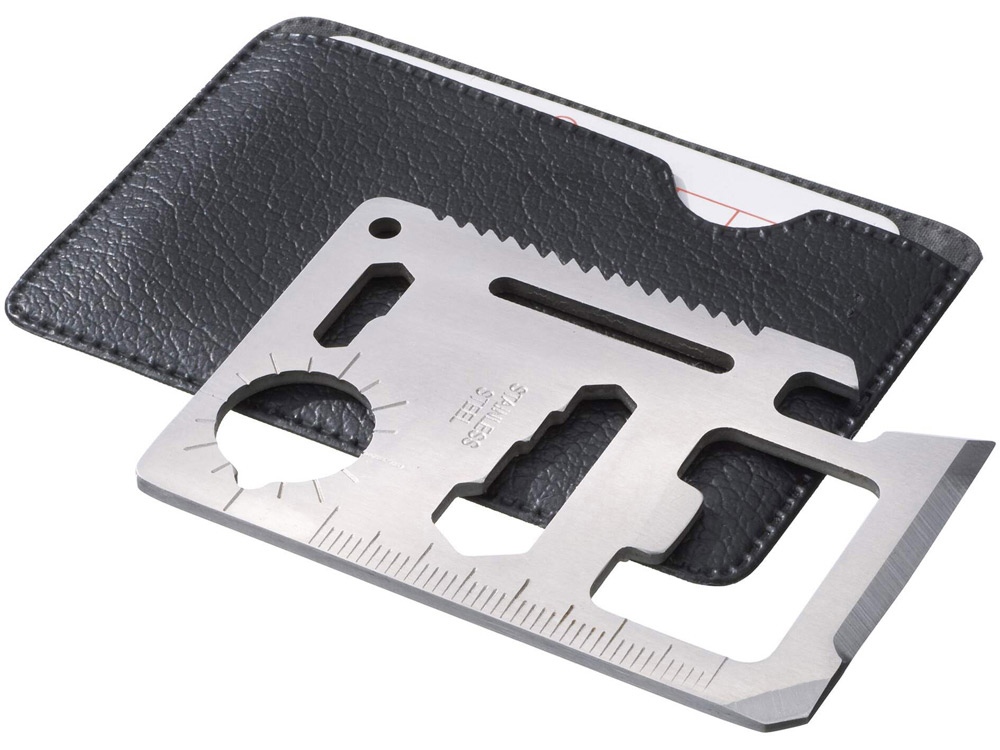 Многофункциональная карта. 11 функций в одной карте - нож, консервный нож, отвертка, линейка, открывалка, 2-х и 4-х позиционный гаечный ключ, разводной гаечный ключ, режущий диск, брелок, указатель направления. Чехол из кожзаменителя.