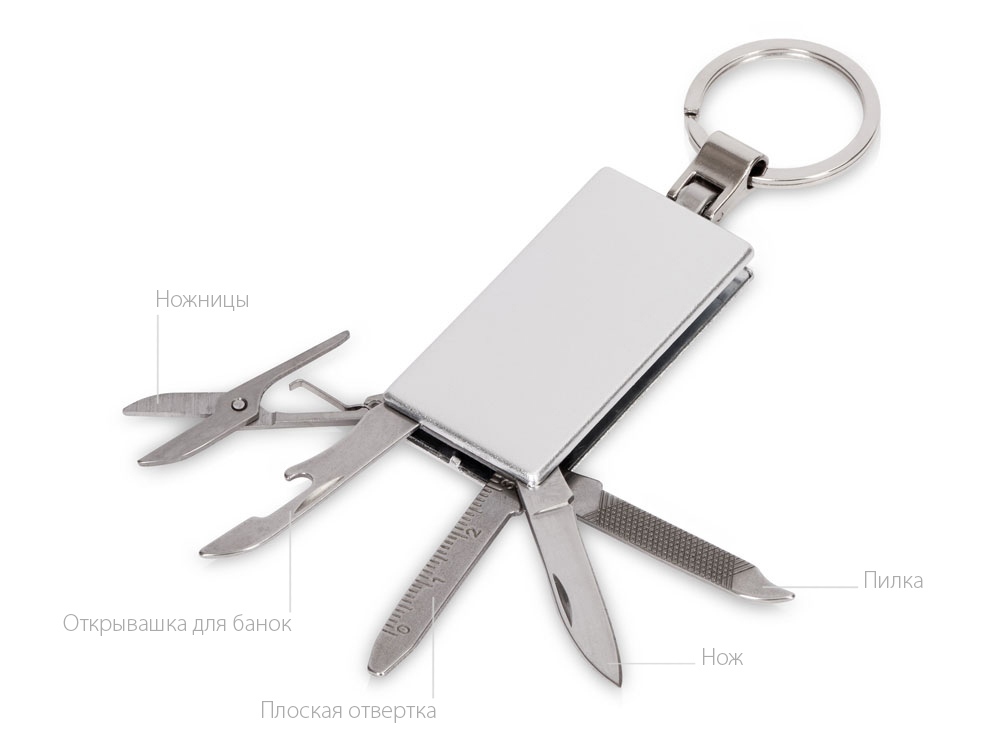 Брелок-мультитул на кольце в металлическом корпусе с заметным полем под нанесение.