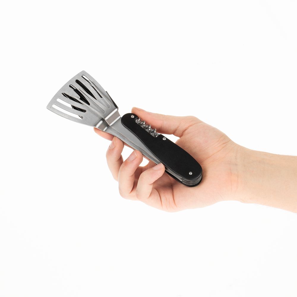 В одном инструменте объединены шесть функций: лопатка, ложка, кулинарная кисть, вилка, нож и штопор. Это позволяет легко выполнять все основные задачи во время барбекю с максимальным удобством.