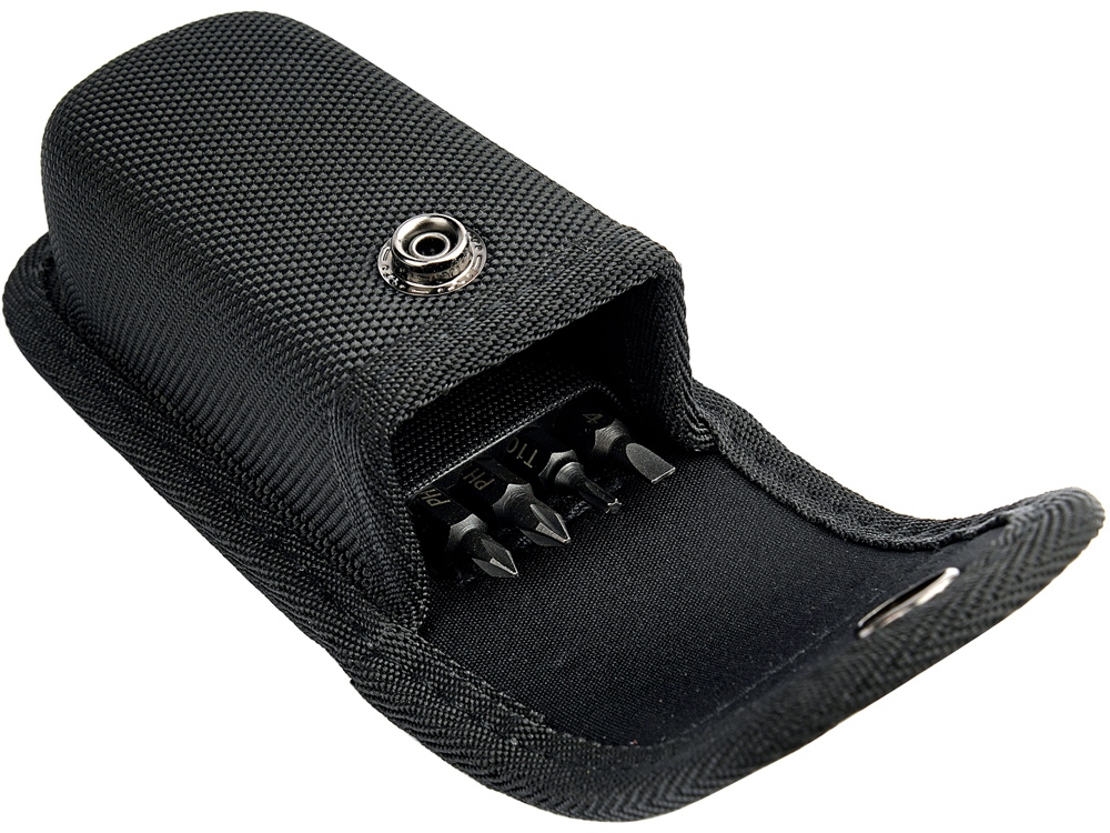 Комплектность: мультитул, нейлоновый чехол на кнопке с карманом для бит, 4 двусторонние биты