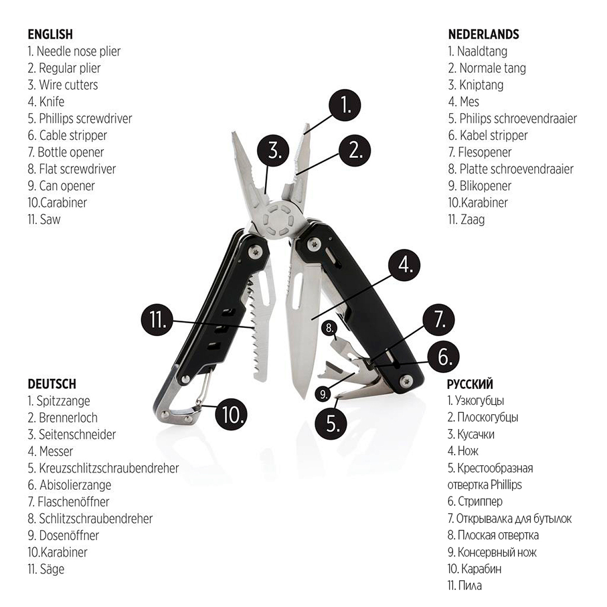 Надежный и долговечный мультитул с 11 функциями. Корпус выполнен из алюминия, а инструменты — из нержавеющей стали. В мультитуле предусмотрены: узкогубцы, плоскогубцы, кусачки, нож, крестообразная отвертка Phillips, стриппер, открывалка для бутылок, плоская отвертка, консервный нож, пила и карабин для крепления. Поставляется в фирменной коробке. Длина 10,5 см., ширина 4,1 см., высота 2,2 см., диаметр 0 см.