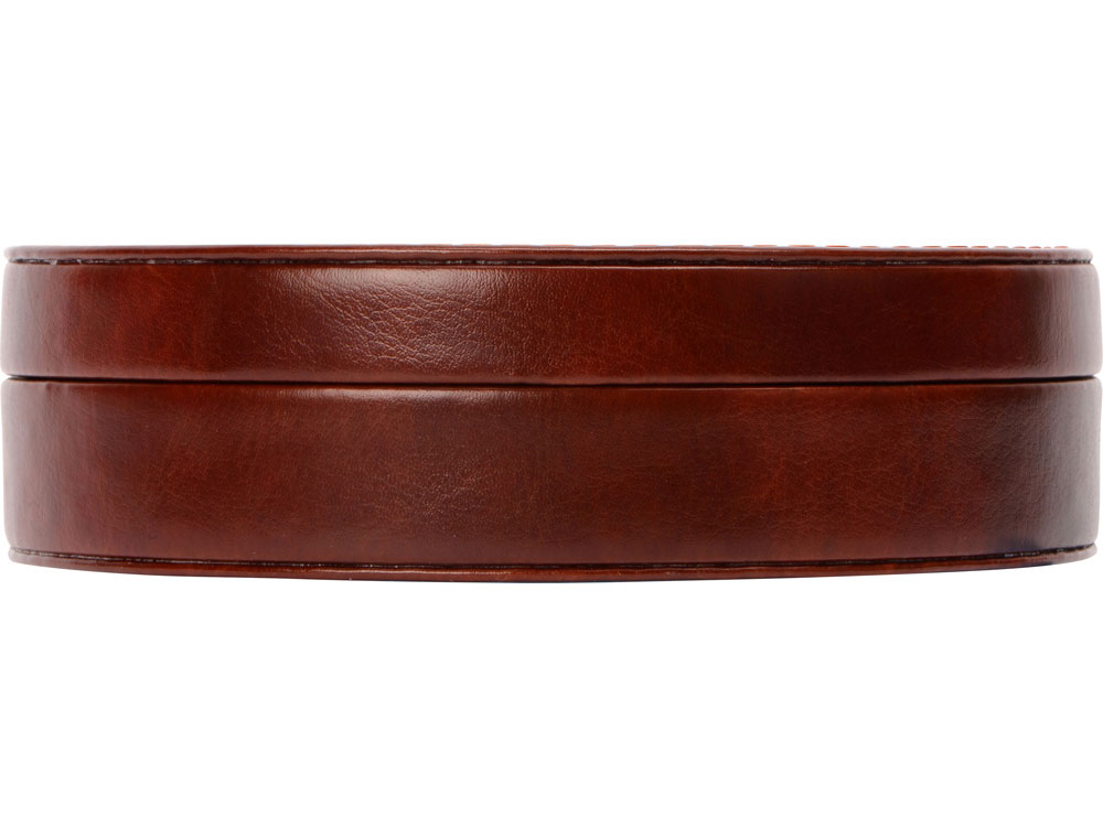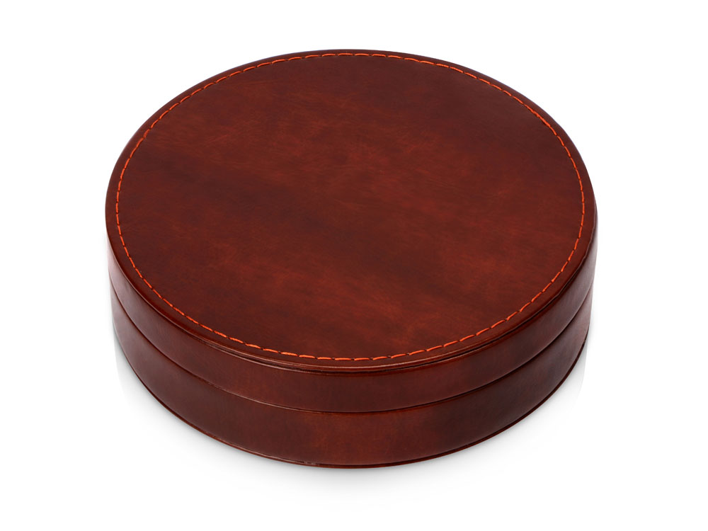 Винные принадлежности разложены в красивом круглом футляре на бархатистом вырубленном ложементе, где для каждого инструмента предусмотрено свое место. Снаружи набор обтянут искусственной кожей, точно такой же по текстуре и цвету, что и другие изделия серии Fabrizio, что позволяет составлять с ними гармоничные комплекты.