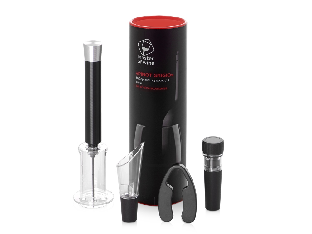 В винном наборе Pinot Grigio собрано все, что необходимо для откупоривания, подачи и длительного хранения вина. Аксессуары поставляются в эффектном красном тубусе и брендированном шубере.