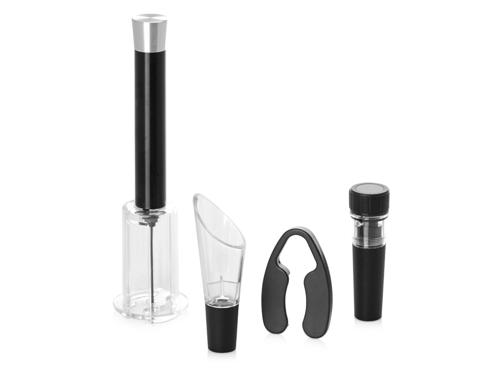 Комплектность: пневматический штопор 19 x 4,8 x 1,8 см, винная пробка 2, 5 x 1,7 x 8,5 см, аэратор 3 x 1 x 9,5 см, нож для фольги 7 x 4,5 x 0,9 см
