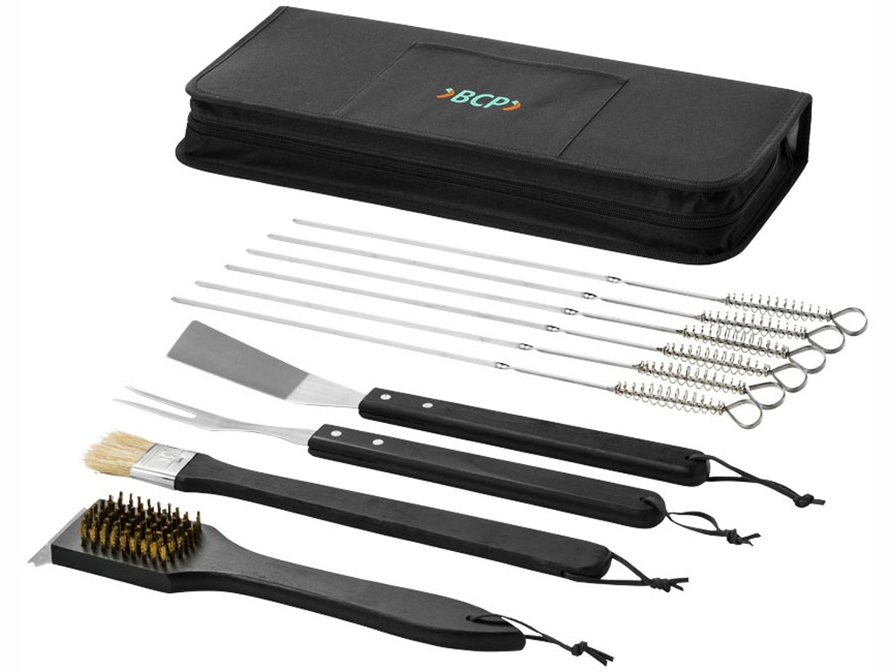 Набор для барбекю Asado из 11 предметов. Набор для барбекю включает лопатку для рыбы, кисть, вилку и щетку для очистки с деревянными ручками, шесть шампуров и чехол на молнии с передним карманом для нанесения. Нанесение не предлагается на отдельные элементы набора. Нержавеющая сталь и полиэстер 600D.