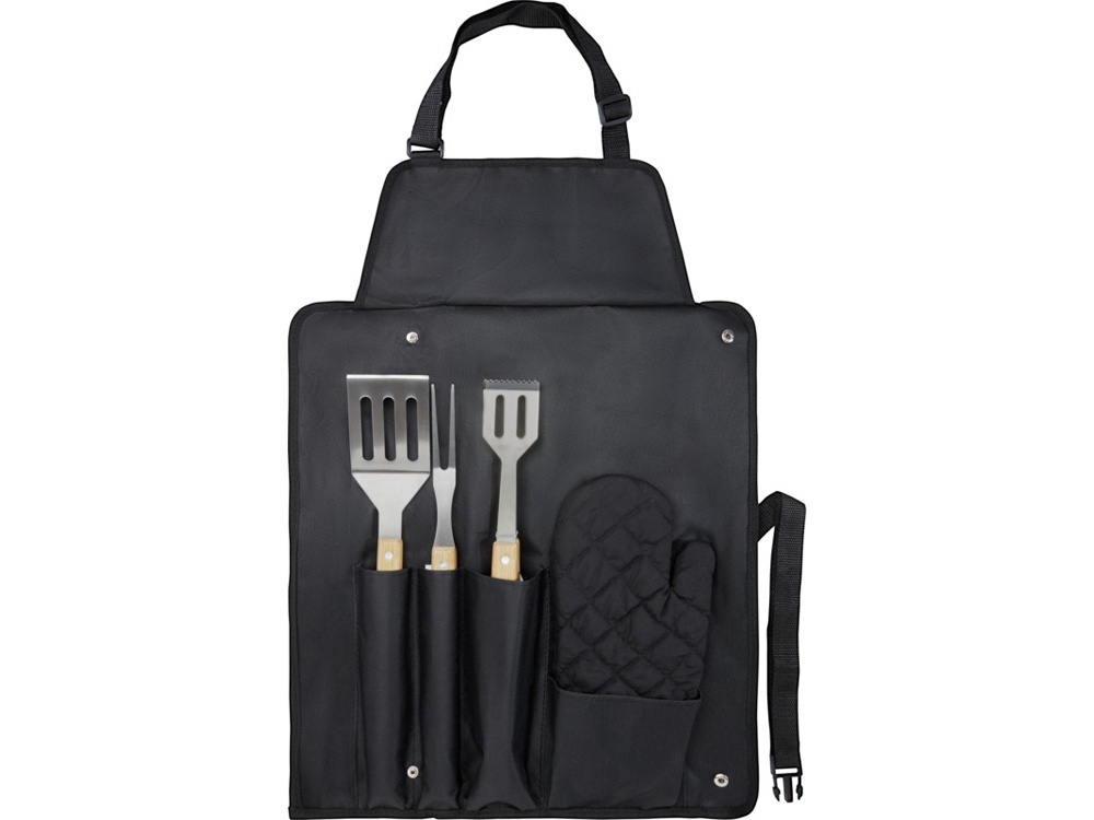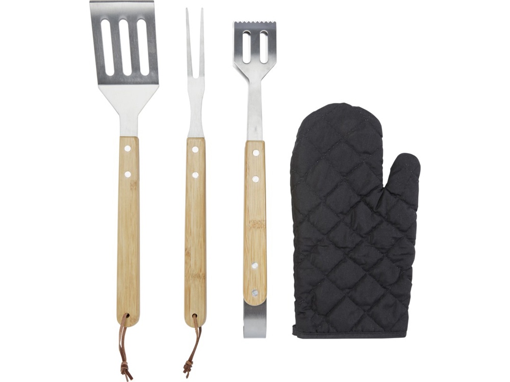 Набор для барбекю из 5 предметов: лопатка (36,5 x 7 см), вилка (36,5 x 2 см), щипцы (36,5 x 5 см), перчатка (25 x 16 см) и фартук с сумкой (42 x 60 см). Ручки сделаны из бамбука, который добывается и производится в соответствии со стандартами устойчивого развития.