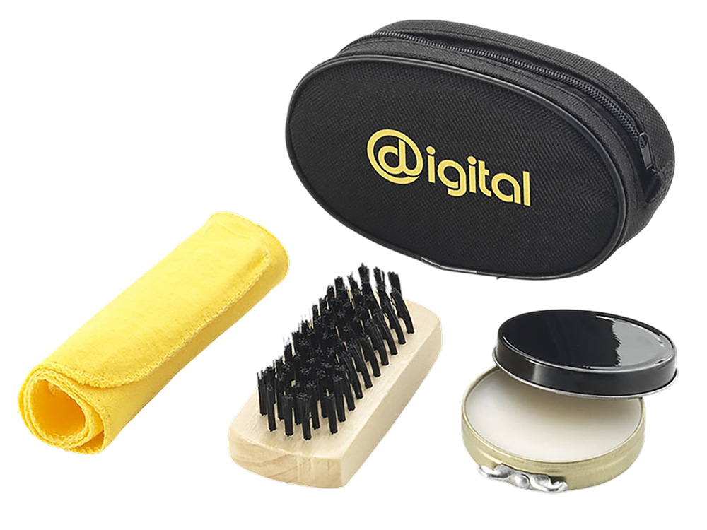 Набор для ухода за обувью - отличный подарок для тех, кто часто ездит в деловые поездки. В наборе такие необходимые аксессуары, как бесцветный крем для обуви, щетка, салфетка для полировки. Компактно упакованы в нетканый чехол, на который можно нанести изображение.