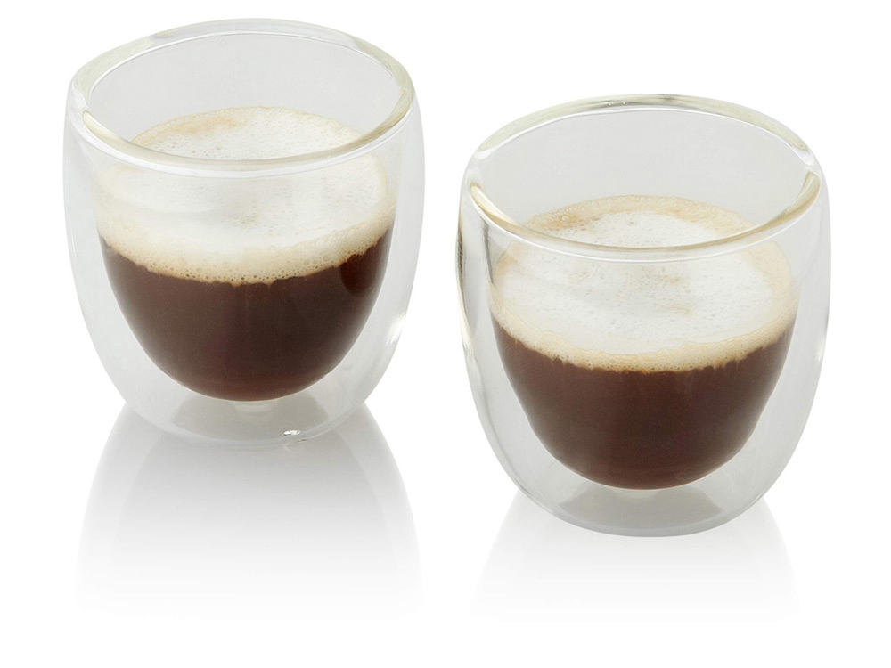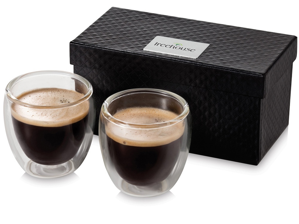 Набор Boda для эспрессо из 2 предметов. Стаканы для эспрессо с двойными стенками емкостью 80 мл. Набор предлагается в роскошной подарочной коробке. Шильд для нанесения логотипа включен в комплект. Стекло.