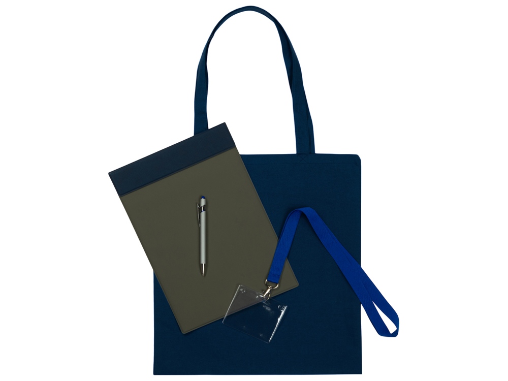 Базовый набор для конференций. В наборе: магнитный планшет для бумаг, ручка для записей, ланъярд и чехол для бейджа участника и шоппер, в который все можно удобно сложить.
