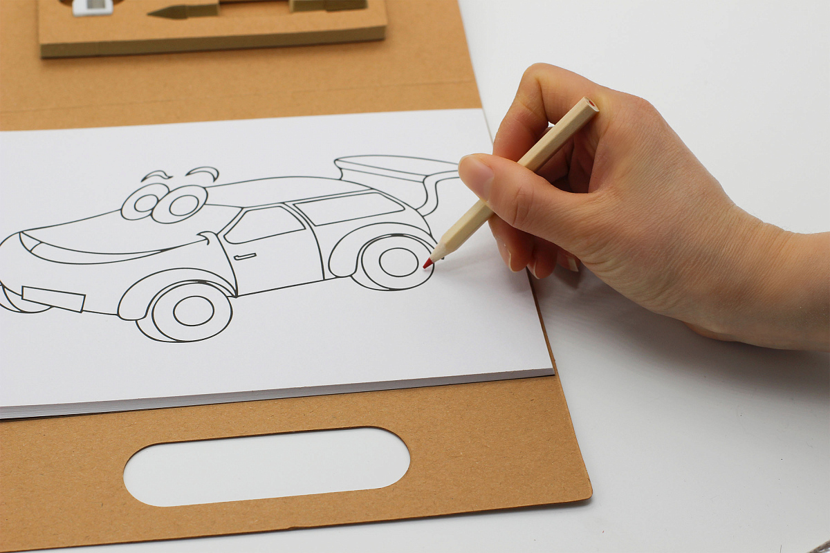 - Картонная папка позволяет удобно хранить все принадлежности и рисунки.