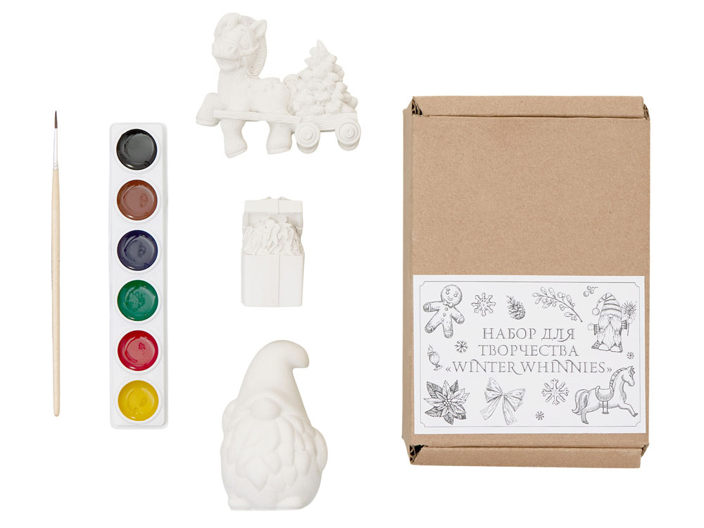 В набор входят три гипсовых фигурки — лошадка елочкой, гном подарочная коробка с пряничными человечками, а также акварельные краски и кисть.