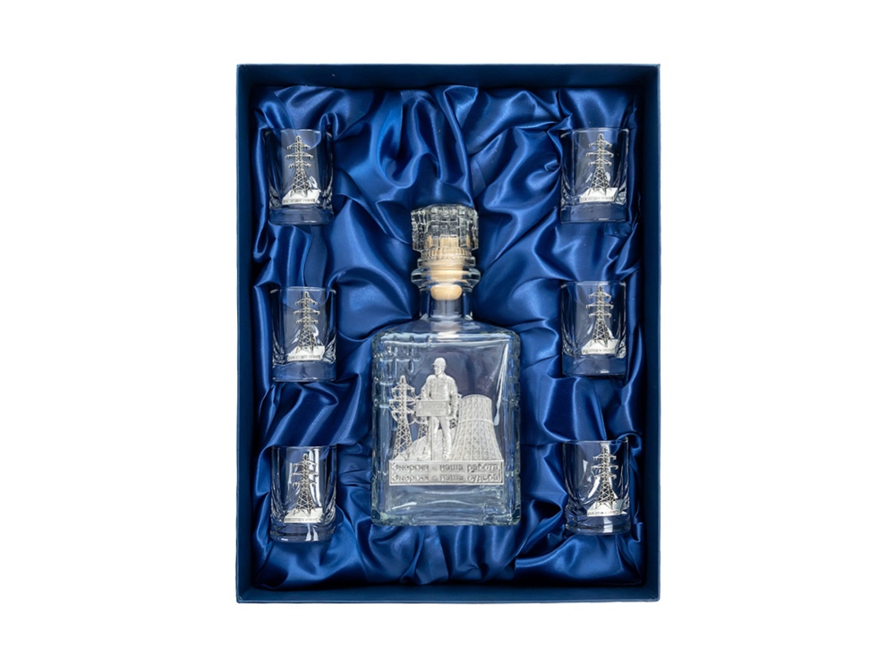 Подарочный набор со штофом Энергетики. Традиционная для русского человека комплектация: элегантный графин емкостью 700 мл. с оловянным барельефом ЭНЕРГЕТИК и 6 стопок емкостью 50 мл. с оловянным барельефом Опора ЛЭП. Материал барельефов: сплав с содержанием олова не менее 95%(пьютер). Художественное литье,чернение с эффектом антикварного серебра,полировка. Ручная работа. Подарочная упаковка люкс с атласным ложементом.