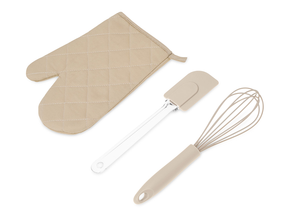 Набор Canele состоит из трёх предметов, без которых не обходится приготовление ни одного пирога или торта: венчика для взбивания яиц или крема, лопатки и прихватки для горячего.