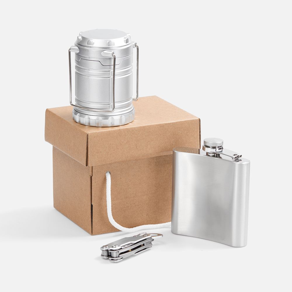 Практичный сет для похода в лаконичном и стильном исполнении: мультитул-плоскогубцы, кемпинговый фонарь с дальностью луча 20 метров и классическая фляжка.