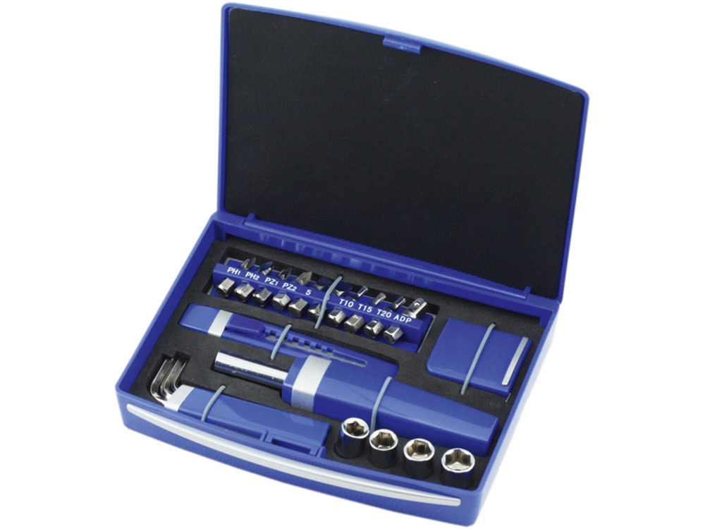 Комплектность: рулетка- 1шт, ручка для сменных насадок- 1шт, сменные насадки- 10шт, ключ-шестигранник (3,4,5 мм)- 3шт, строительный нож- 1шт, торцевая насадка (7, 8,