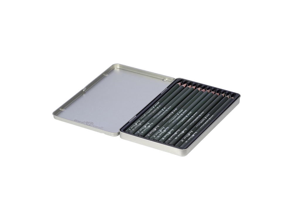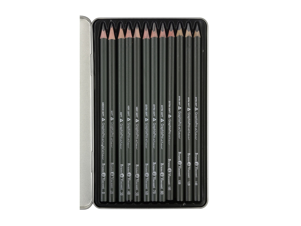 Комплектность: 12 карандашей разной твердости (B, 2B, 3B, 4B, 5B, 6B, 7B, 8B, 9B, 10B, 12B, 14B), металлическая коробка
