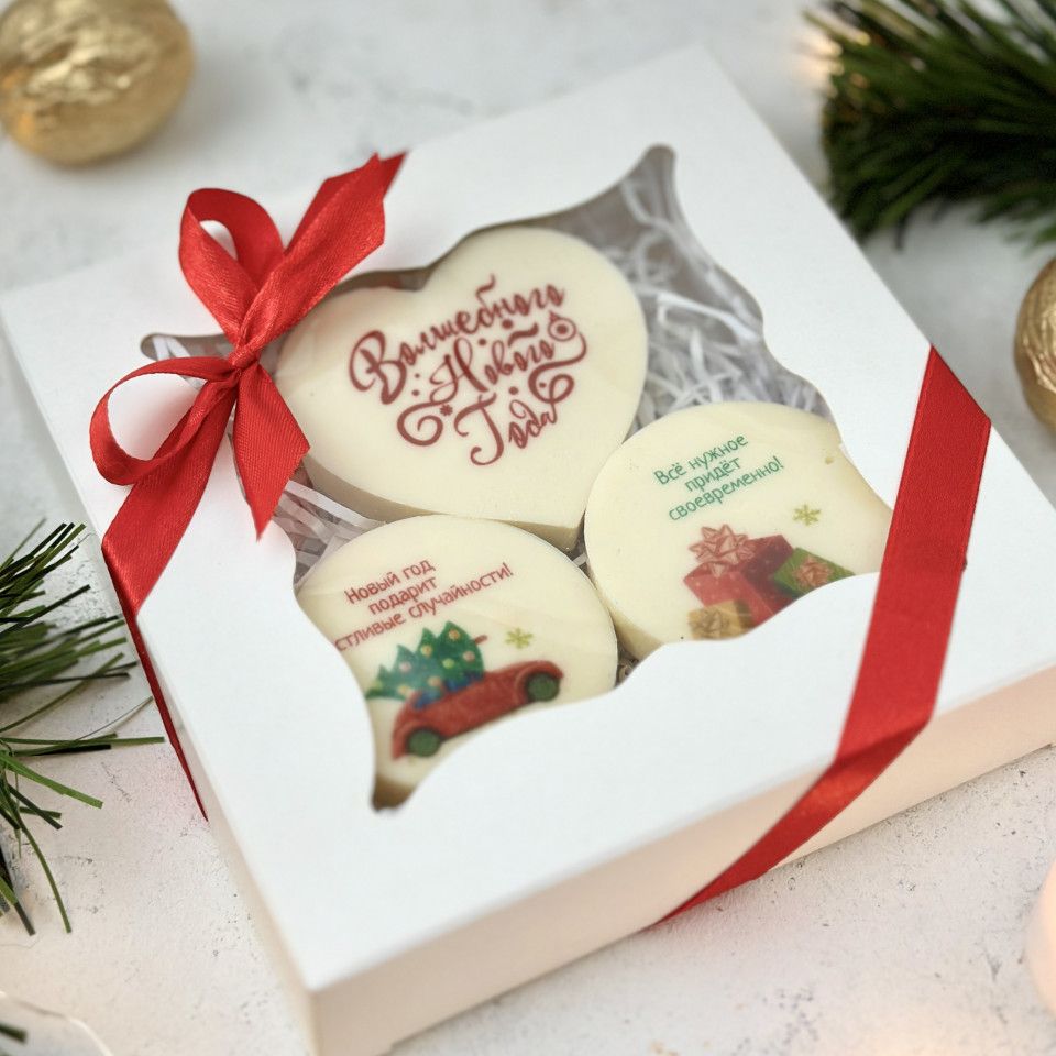 Набор нежнейшего песочного печенья, глазированного белым шоколадом, с теплыми новогодними пожеланиями. При нанесении изображений используются только безопасные пищевые красители.