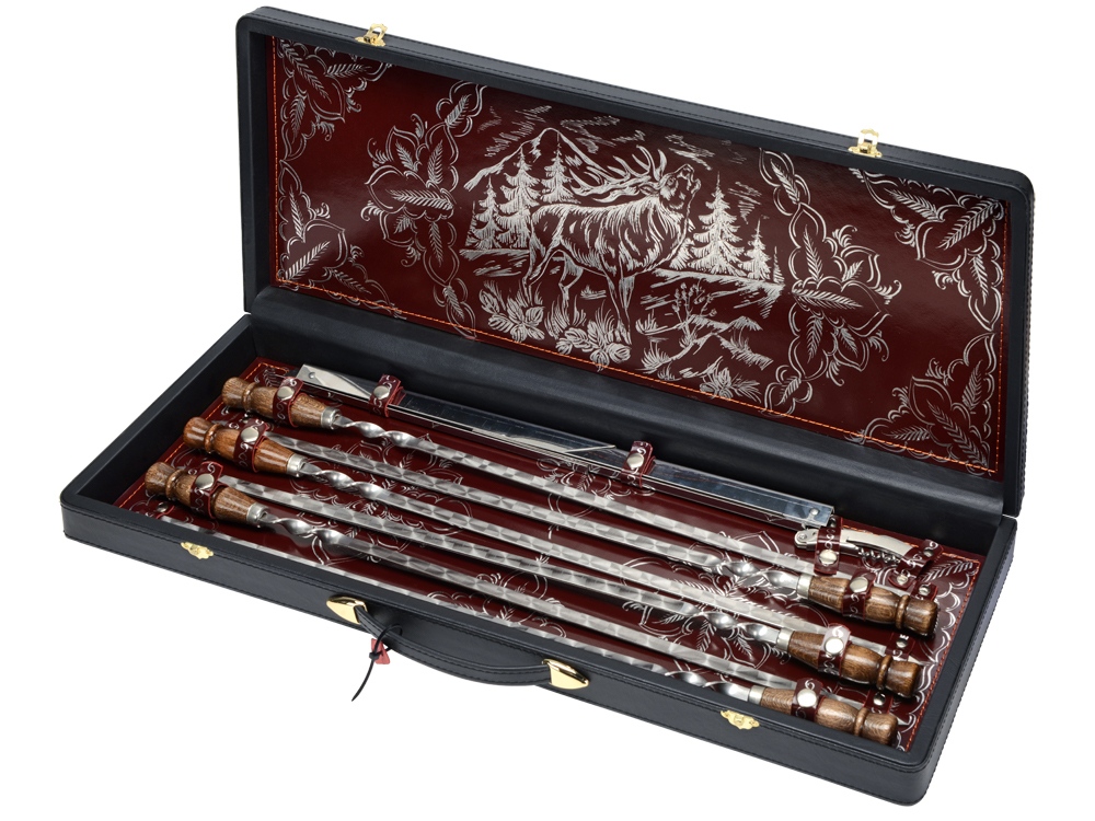 Солидный чемоданчик с набором шампуров и мангал не оставят равнодушными ни одного любителя шашлыка. Немаловажно, что ручка у шампуров деревянная - кроме красоты, это еще и удобно - дерево приятнее брать, оно не нагревается (если, конечно, не совать его в огонь). Кроме того, в подарке имеются нож сомелье, с помощью которого вы сможете с легкостью открыть бутылку.