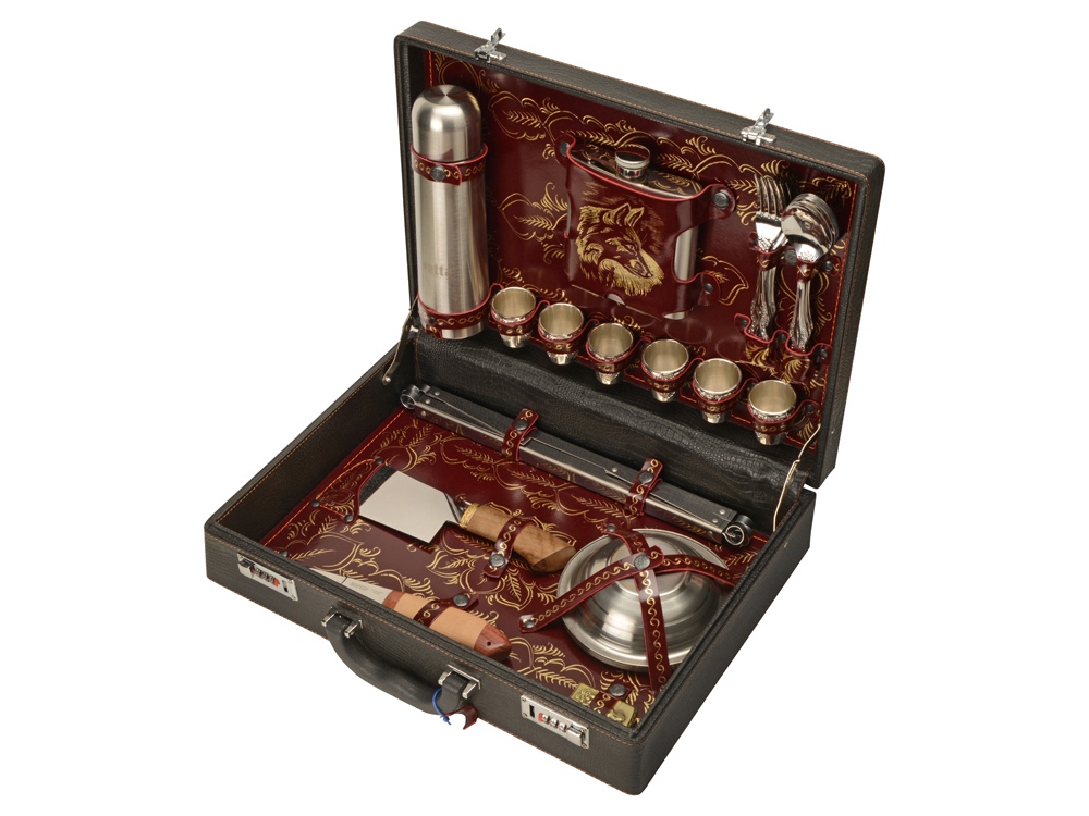 Комплектность: нож, нож-тяпка, зажигалка, тарелка, шампур- 6шт, термос, стопка- 6шт, фляжка, вилка - 6шт, ложка - 6шт