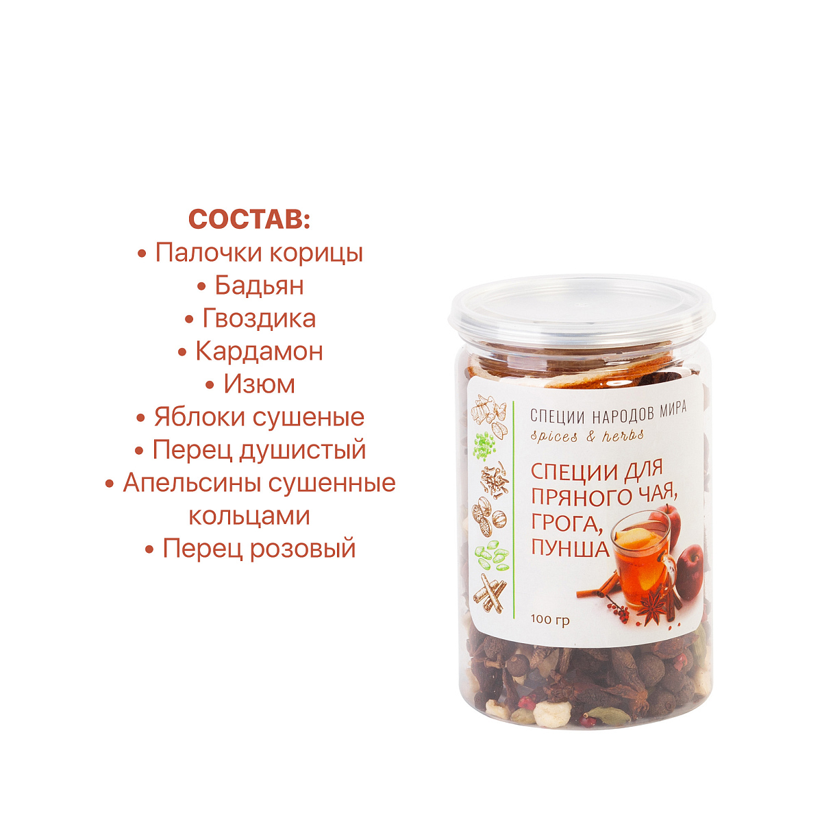 - специи для глинтвейна, пряного чая, пунша, грога 100 гр (3 порции: палочки корицы, бадьян, гвоздика, кардамон, изюм, яблоки сушеные, перец душистый, апельсины сушеные кольцами, перец розовый); h 11 х d 7 см;
