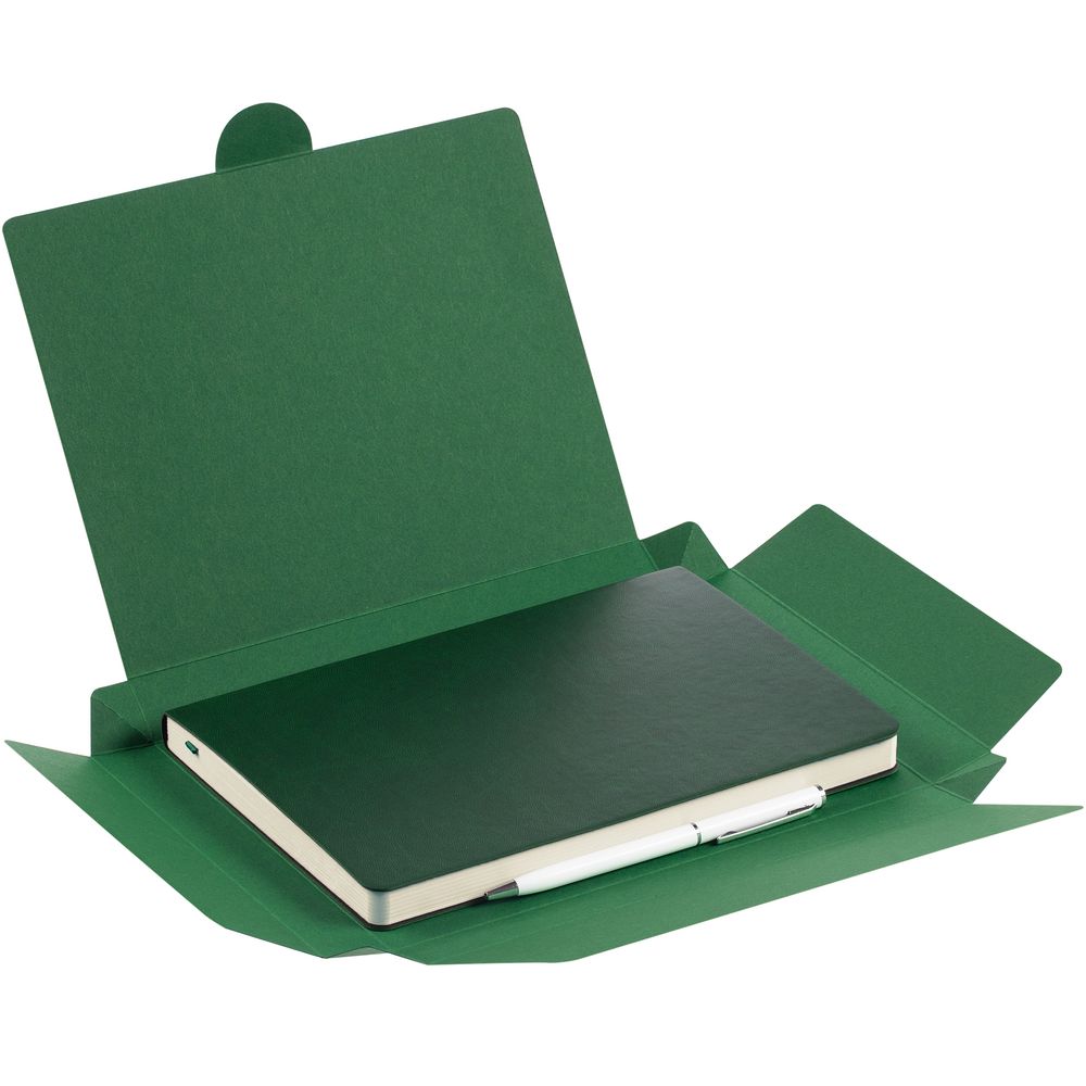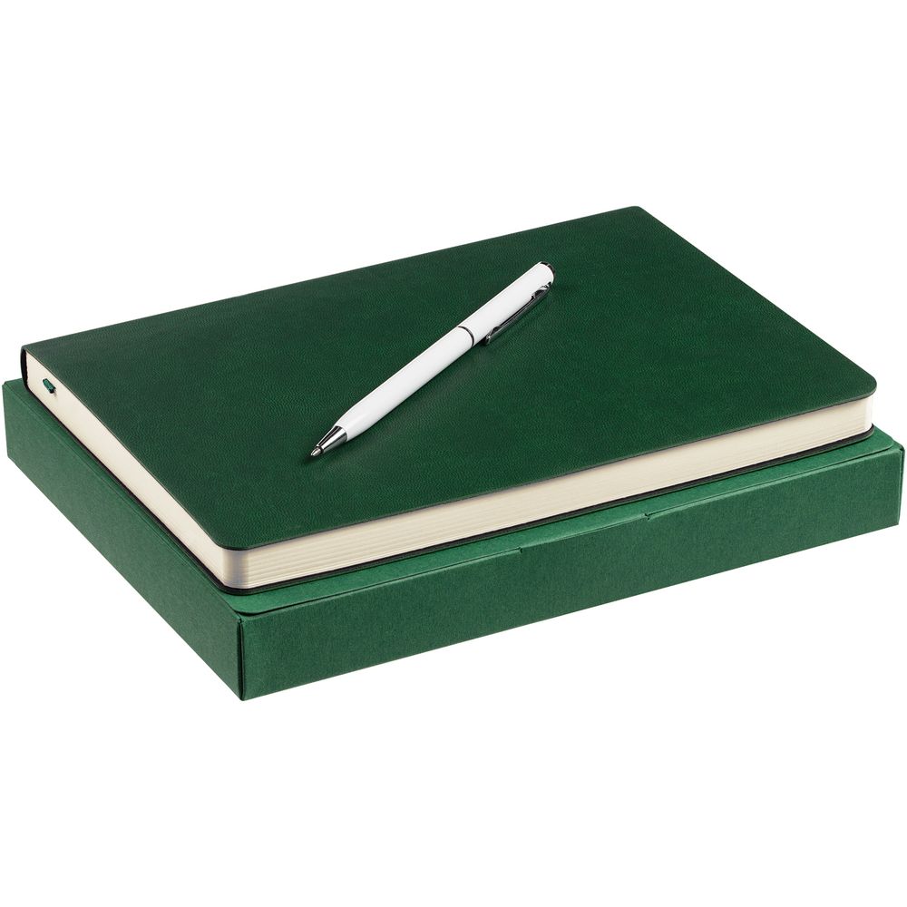 Недатированный ежедневник с гибкой обложкой из материала Latte с ляссе в цвет обложки, а также ручка в тон — в подарочной коробке из дизайнерского картона.