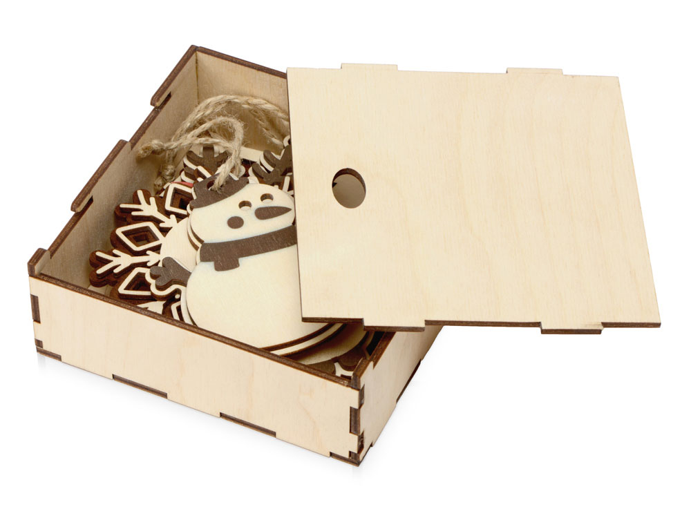 Набор из пяти новогодних подвесок упакован в коробку-футляр из березовой фанеры. Брендировать можно как сами игрушки, так и упаковку, причем помимо традиционной для фанеры гравировки предусмотрена возможность использования и других методов нанесения. Подвески будут напоминать о вашем бренде каждое рождество, создавая праздничное настроение, а футляр в дальнейшем может использоваться в качестве шкатулки для мелочей или для рукоделия.