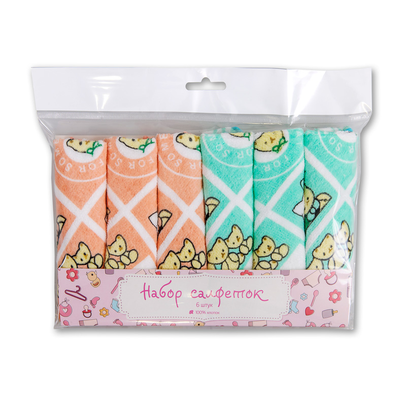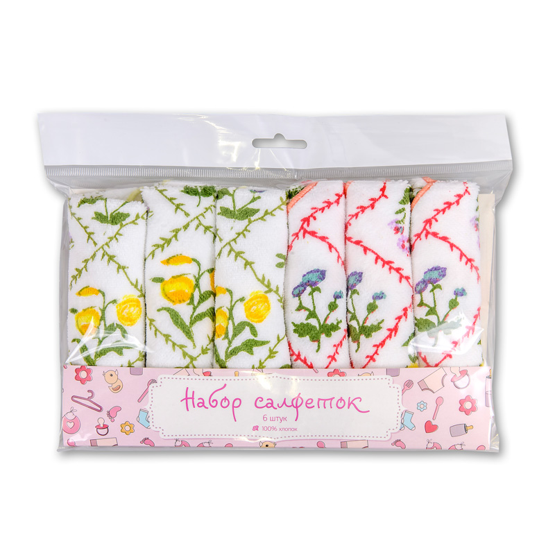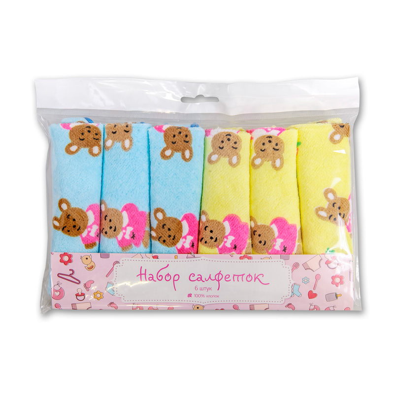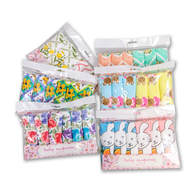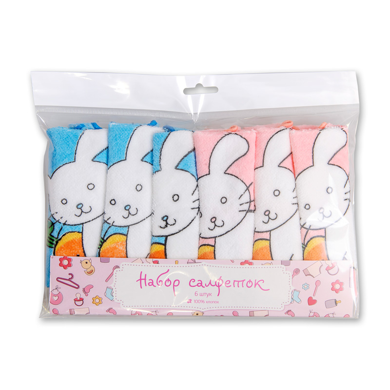Набор мягких махровых велюровых салфеток с детскими печатными рисунками из экоклогически чистого 100% хлопка. Упакован в пакет с еврослотом и розовым вкладышем, 6 салфеток.