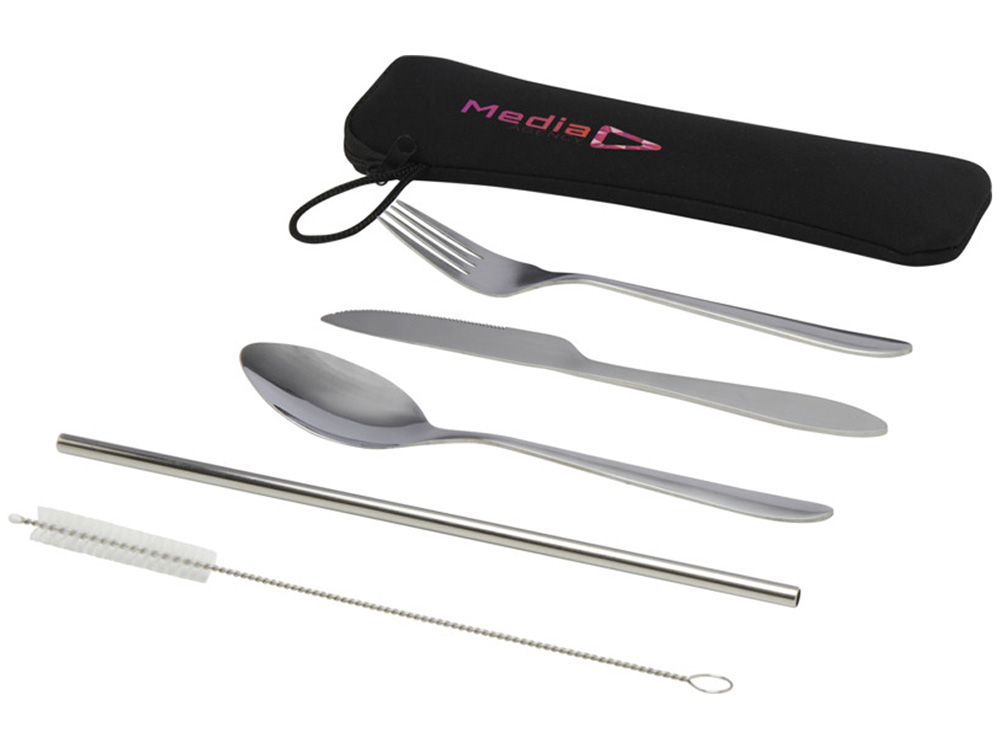 Набор столовых приборов Sheen включает вилку, нож, ложку, многоразовую соломинку и щёточку для её очистки. Все элементы выполнены из прочной и легко моющейся нержавеющей стали. Комплект удобно хранить и переносить в прочном чехле из неопрена с удобной петлей.