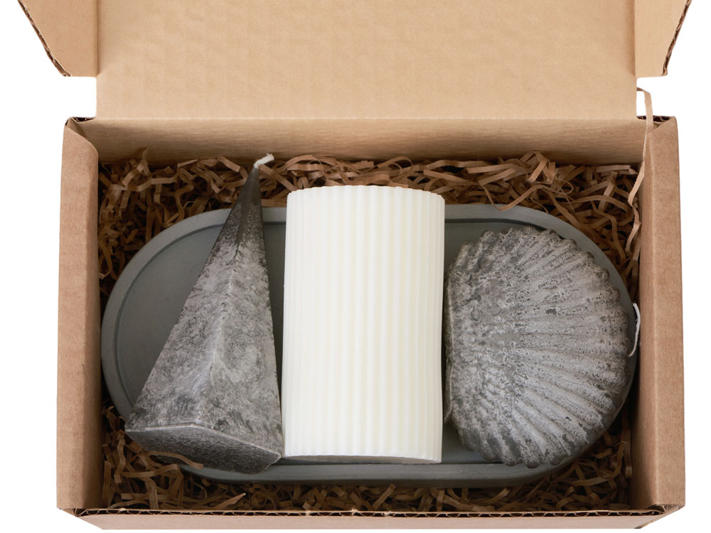Комплектность: свеча столбик, свеча пирамида, свеча ракушка, подставка гипсобетон, упаковочный материал