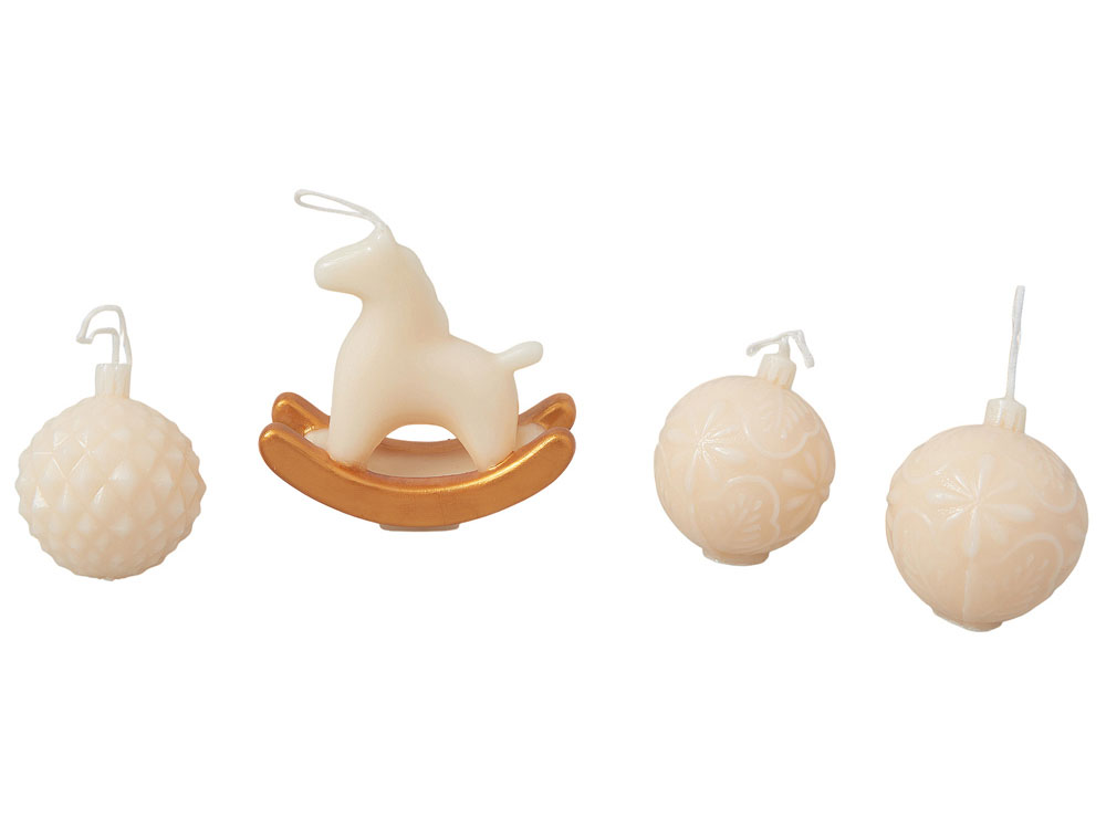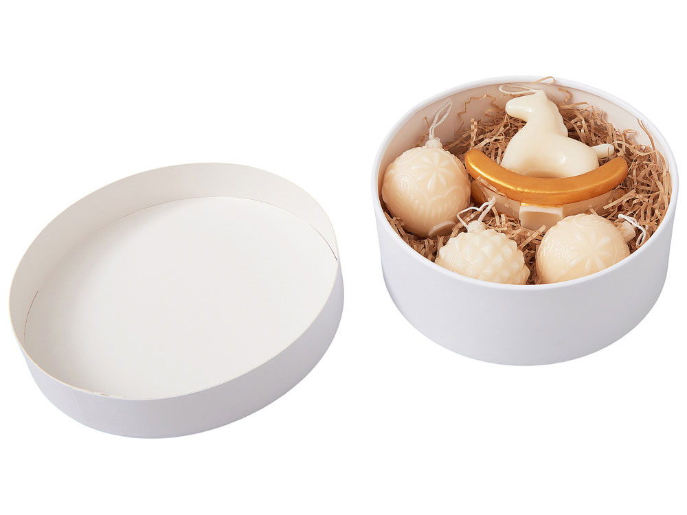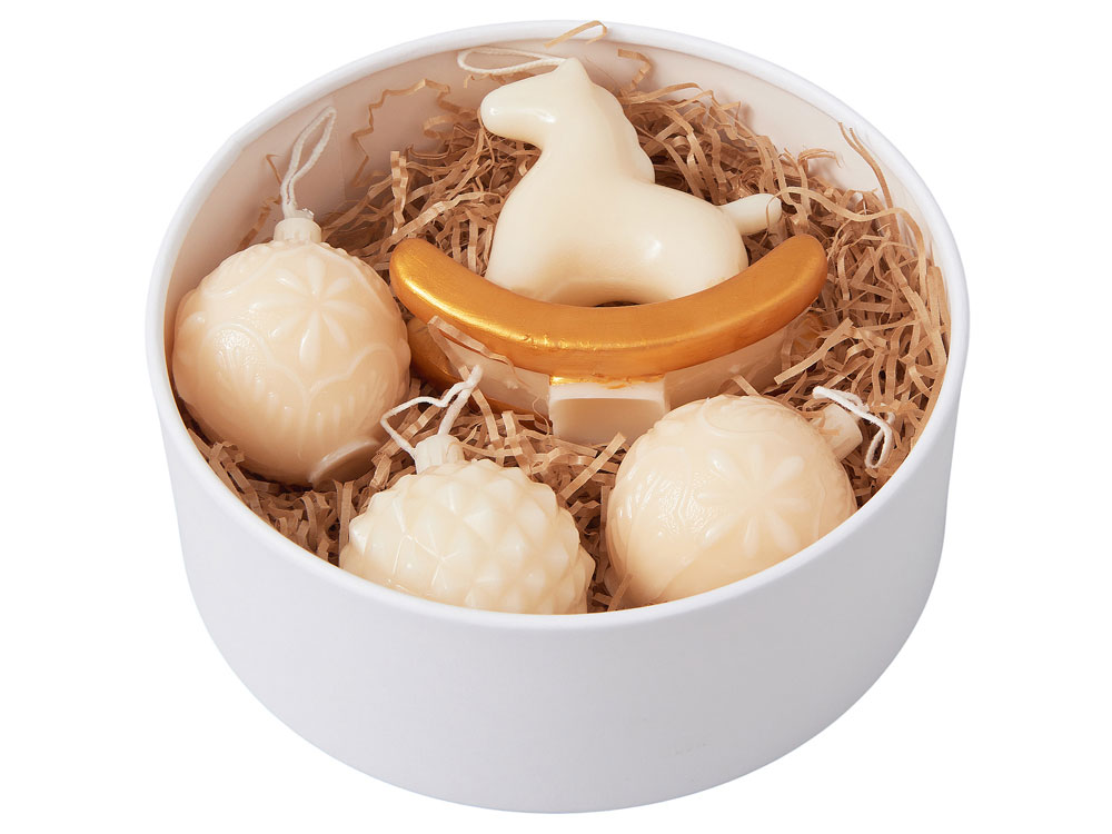 Набор свечей в подарочной коробке Noel - элегантный штрих к праздничному декору. В круглой коробке с крышкой — три свечи в форме новогодних шаров и одна в виде лошадки, выполненные из утончённой смеси кокосового, соевого воска и парафина.
