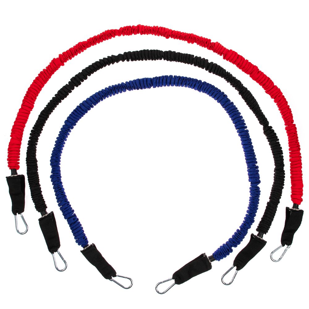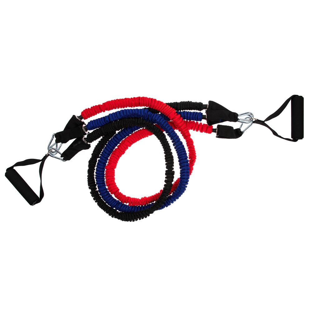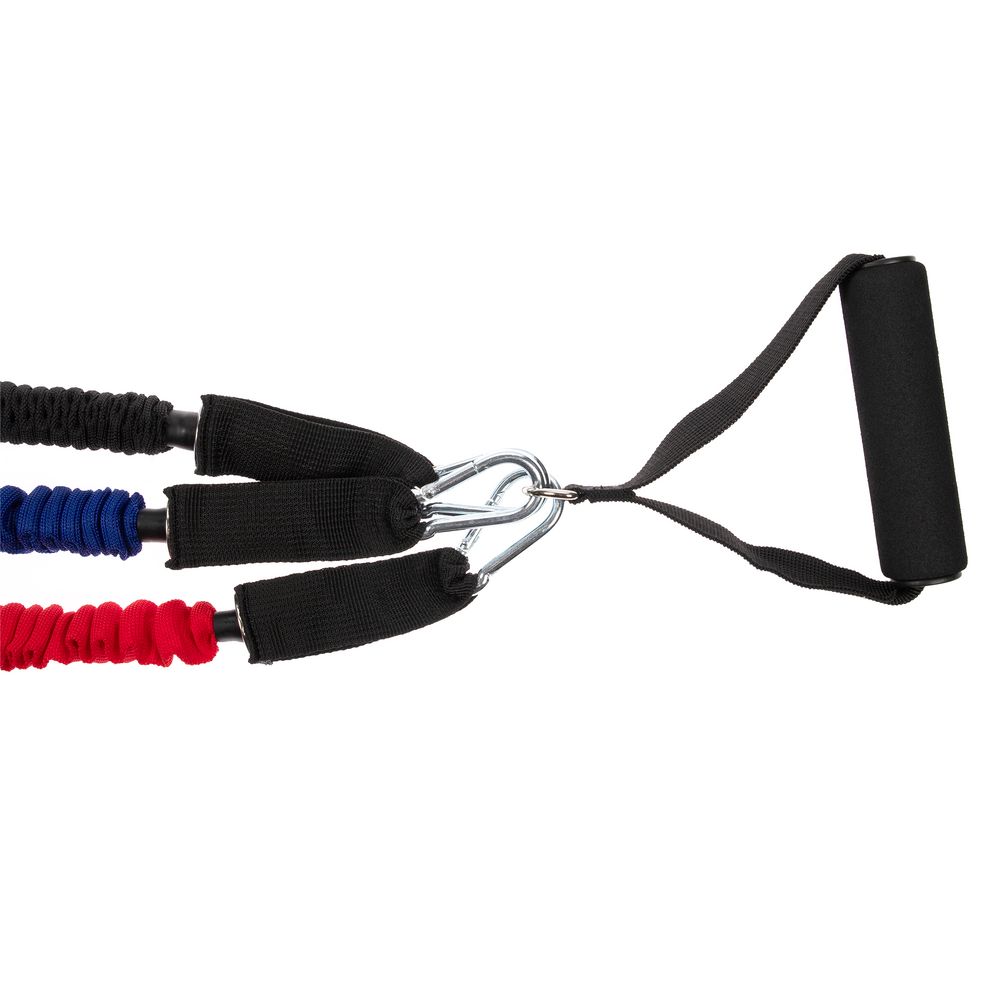 В набор входят 3 трубчатых эспандера с разной степенью нагрузки от 6,8 до 15,8 кг. Меняя и комбинируя их, можно усиливать или ослаблять нагрузку во время тренировки.