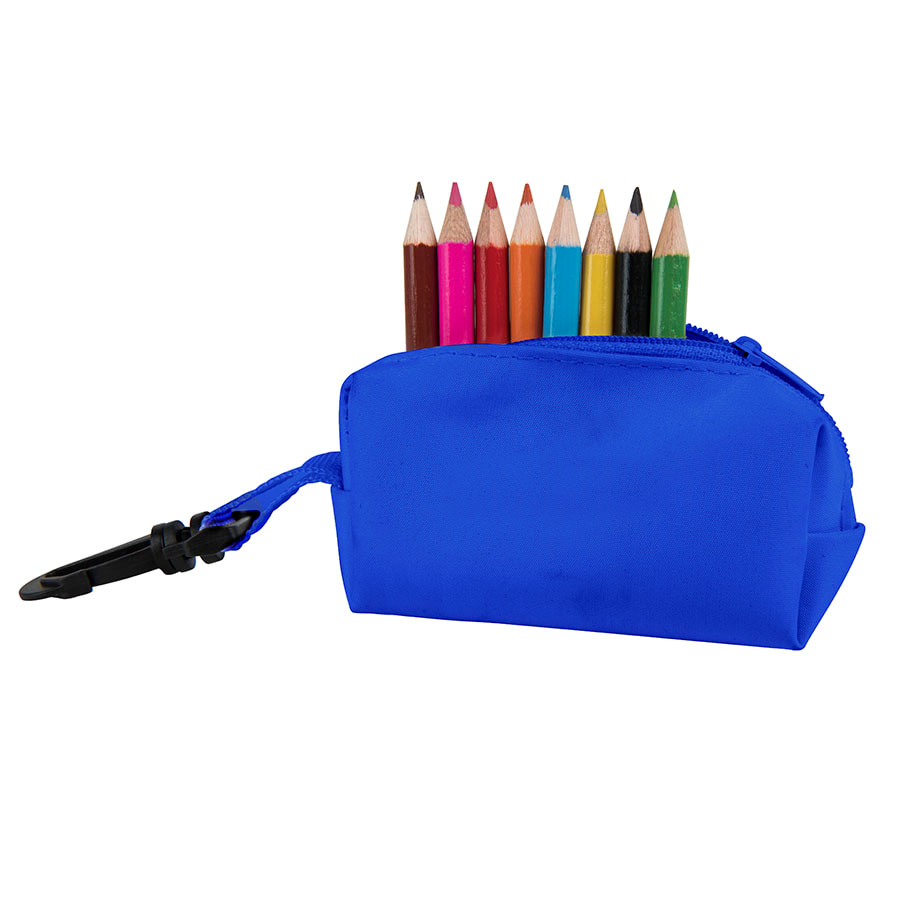 Цвета карандашей: голубой, красный, зеленый, желтый, оранжевый, розовый, коричневый, черный. Все карандаши заточены. Набор поставляется в текстильном чехле с карабином. Также в набор входит точилка из прозрачного пластика.