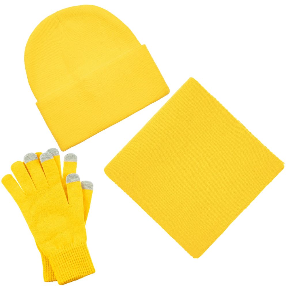 В комплект входят двухслойная шапка с регулируемым отворотом и легкий однослойный шарф из мягкой акриловой пряжи, сохраняющие тепло и защищающие от ветра, а также эргономичные перчатки со специальными токопроводящими волокнами на кончиках пальцев, в которых можно свободно пользоваться смартфоном даже в холодную погоду. Универсальная цветовая гамма и лаконичный дизайн делают набор органичным дополнением к любой верхней одежде.