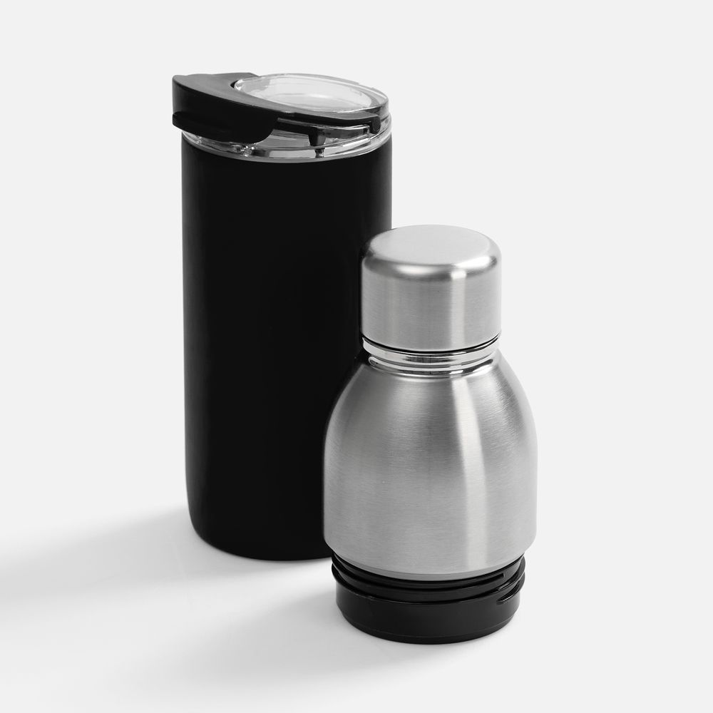 Varianti — это яркий пример посуды с двойной функциональностью. Один и тот же корпус можно превратить как в термостакан для чая и кофе с пластиковой крышкой, так и в термобутылку для прохладительных напитков — с крышкой стальной.